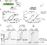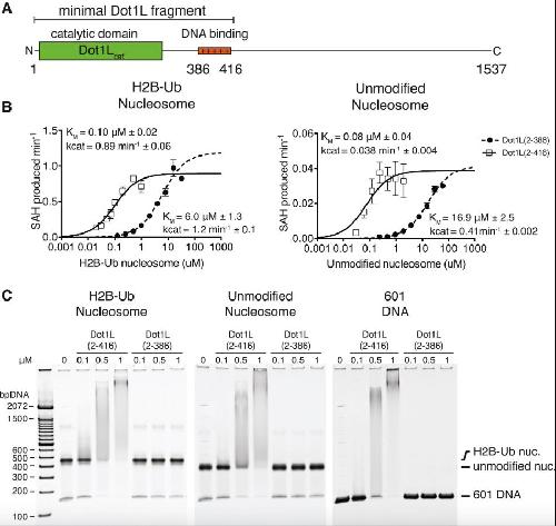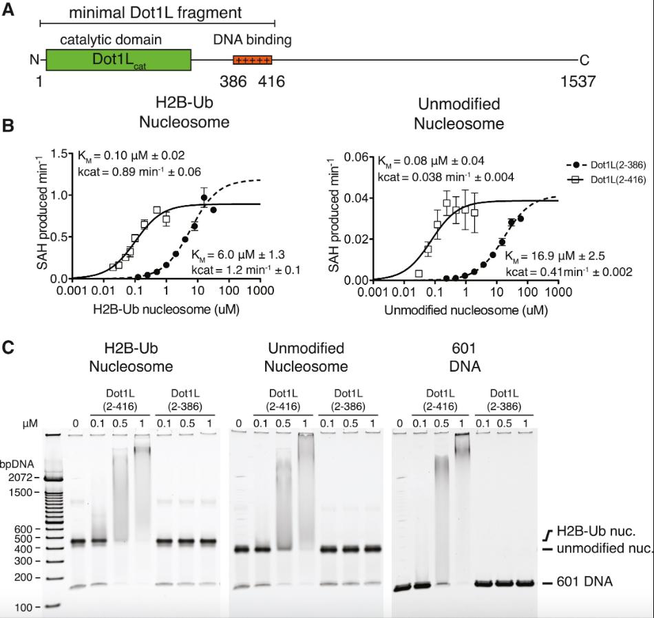Figure 2. Analysis of Dot1L Binding and Activity (A) Schematic of the Dot1L domain architecture. (B) Michaelis-Menten titrations of two variants of Dot1L. Left: titration with H2B-Ub nucleosome. Right: titration with unmodified nucleosome. Error bars correspond to the standard error of three replicate measurements. The kcat and KM of the fitted data are reported in the graph field. The reported errors of the fitted kcat and KM correspond to the standard error. (C) Electrophoretic mobility shift assay of Dot1L variants binding to different nucleosome substrates and to free DNA. |
