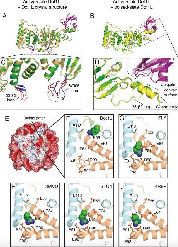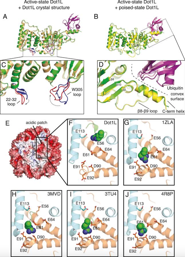 Figure S5. Structural Comparisons of Dot1L in Different States, Related to Figures 3 and 4 A Superimposition between the active state Dot1L and the Dot1L crystal structure (PDB: 1NW3). B, Superimposition between the active state and poised sate Dot1L. The disordered Dot1L F131 and W305 loops in the poised state are depicted as dashed yellow lines. C, Close up view of loop restructuring that occurs in Dot1L during the transition to the active state. The active state loops are colored red and the loops from the crystal structure of Dot1L (PDB: 1NW3) are colored blue. D, Close up view of the superimposed Dot1L-ubiquitin interaction in the poised and active states showing that the contact surface does not change. The convex surface made up by the Dot1L C-terminal helix and the β8- β9 loop is depicted as a dashed line. E, Surface representation of the nucleosome colored by electrostatic potential. The highly charged acidic patch is indicated by the black square. F-J, Close up views of the arginine anchor interaction with the acidic patch for different protein-nucleosome complexes. F, Dot1L, G, LANA peptide (PDB: 1ZLA), H, RCC1 (PDB: 3MVD), I, Sir3 (PDB: 3TU4), J, PRC1 Ubiquitylation Module (PDB: 4R8P). |