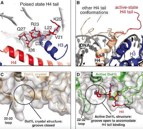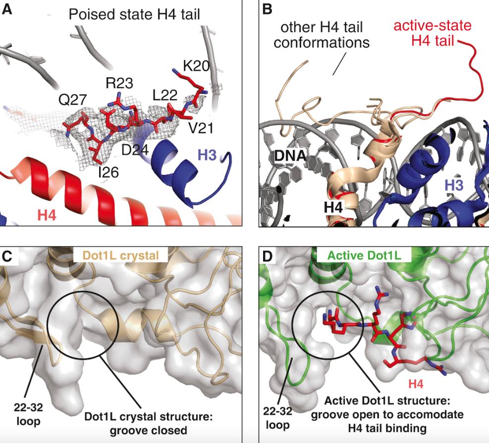 Figure S6. Details of the H4 Tail Interaction with Dot1L, Related to Figure 5 A, Example density of the H4 tail in the poised state structure is depicted as a gray mesh and shows that residues after K20 are not structured. B The active state Dot1L structure (red) is superimposed with several high resolution nucleosome crystal structures (PDB: 1KX3,1KX5, 5YOD, 1S32, 3UTA, 5Y0C, 3C1B, 3UT9 and 3UTB) colored tan showing that the H4 tail is usually unstructured or associated with DNA. C, The Dot1L crystal structure (PDB: 1NW3) is depicted in cartoon representation and colored brown with a semi-transparent gray surface. The groove for H4 tail is closed in this state. D, The active Dot1L structure is depicted in cartoon representation and colored green with a semi-transparent gray surface. The groove for the H4 tail is open in this state. |