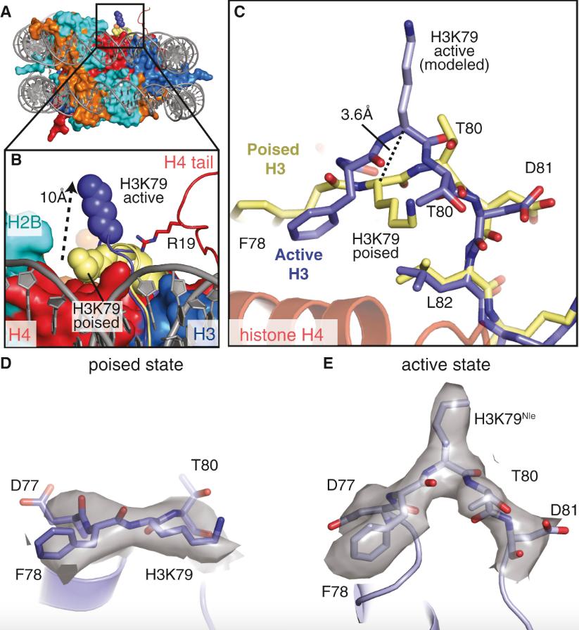Figure 6. Conformational Change in Histone H3 Reorients K79 (A) Superimposition of the active-state and poised-state nucleosomes. The active-state histone octamer is depicted in surface representation and colored as in Figure 1. The H3K79 loops from the active-state (blue) and poised-state (yellow) structures are shown as cartoons, and H3K79 is shown as spheres. (B) Close-up view of H3K79 in the active state (blue spheres) and poised state (yellow spheres). The H3K79 sidechain moves ∼10 Å (measured from ε amino groups) from the poised state to the active state. (C) Superimposition of the histone H3K79 loop from the active-state (blue) and poised-state (yellow) structures showing the conformational change that occurs in the transition from the poised state to the active state. In the transition from the poised state to the active state, the H3K79 backbone moves up by 3.6 Å (measured from the Cα carbons of H3K79) and rotates by an angle of ∼90°. (D) EM density (gray surface) for the H3K79 loop in the poised state. (E) EM density (gray surface) for the H3K79 loop in the active state. See also Figure S7 and Table S1. |