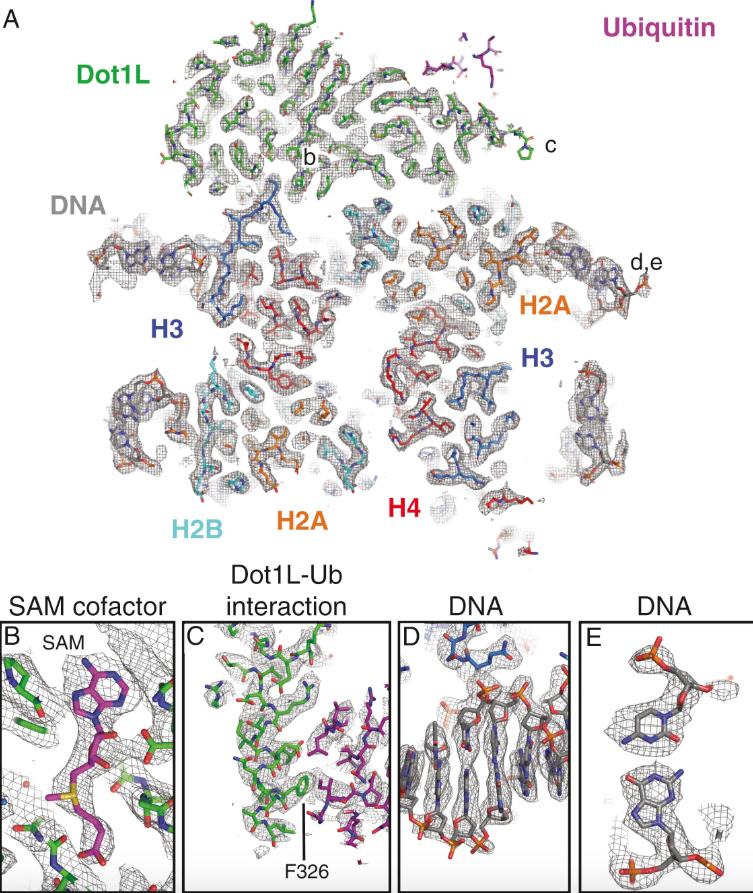 Figure S4. Example Density of the 2:1 Active-State EM Structure, Related to Figure 1 A, A vertical slice through the 2:1 active state structure centered on H3K79Nle. Atomic models of all chains are shown as sticks and the EM density is shown as a gray mesh. Areas highlighted in the boxes are denoted with letters b, c, d and e. B, Example density of the SAM cofactor. C, Example density of the interaction between ubiquitin and the Dot1L C-terminal helix. D,E, Example EM density of the DNA. |
