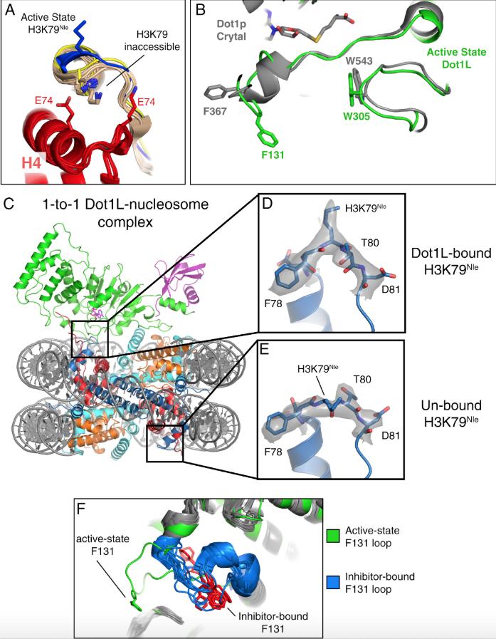 Figure S7. Details of the H3K79 Conformational Change, Related to Figures 6 and 7 A, The active state Dot1L structure (blue) is superimposed with the poised Dot1L structure (yellow) and several high resolution nucleosome crystal structures (PDB: 1KX3,1KX5, 5YOD, 1S32, 3UTA, 5Y0C, 3C1B, 3UT9 and 3UTB) colored tan showing that the sidechain of H3K79 is always held in an inaccessible state. B, Superimposition of the active state Dot1L (green) the yeast Dot1p crystal structure (PDB: 1U2Z, gray) showing the relative conformations of the W305 and F131 loops. The yeast Dot1p residue W543 is in a similar position as W305 in Dot1L. C, Overview of the 1-to-1 active state structure. D, Close up view of the H3K79Nle loop on the side of the nucleosome that is bound by Dot1L showing that H3K79Nle is oriented upward. E, Close up view of the H3K79Nle loop on the side of the nucleosome that is not bound by Dot1L, showing that H3K79Nle is oriented in the inaccessible conformation. F, superimposition between active state Dot1L (green) and several structures of inhibitor bound Dot1L (gray, PDB: 4EKG, 4EKI, 3UWP, 4EQZ, 4ER0, 4ER3, 4ER5, 4ER6, 4ER7,4HRA, 5MW3, 4WV1, 5DTM, 5DTQ, 5DTR, 5DRT, 5DRY, 5DSX, 5DT2, 5MVS, 5MW4) showing that the F131 loop (blue) restructures upon inhibitor binding. F131 in the various inhibitor-bound structures is shown in red stick representation. |