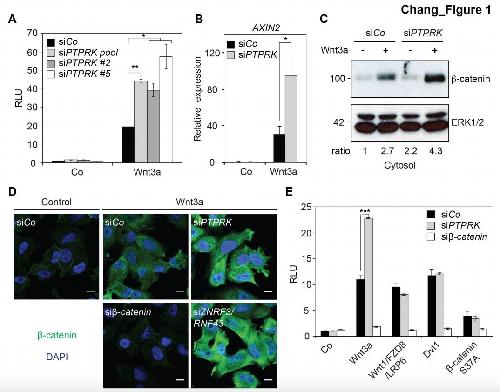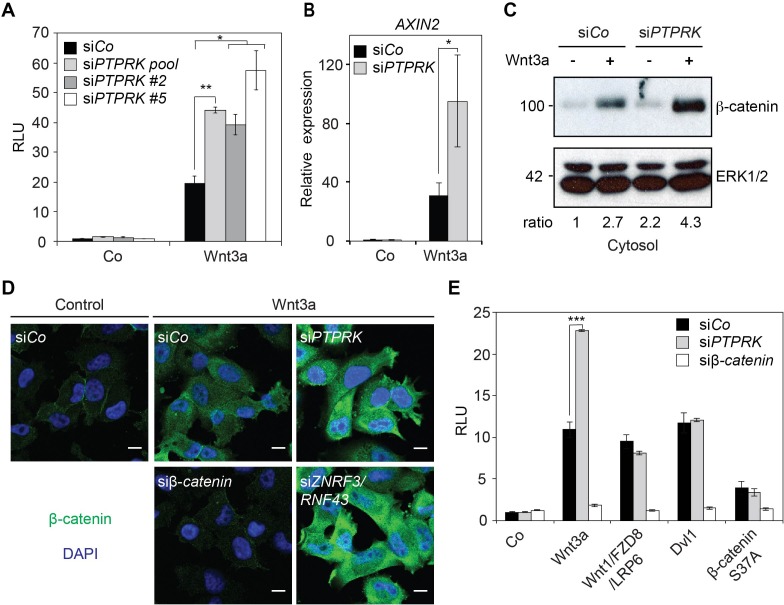 Figure 1. PTPRK inhibits Wnt/β-catenin signaling at the receptor level.(A) Topflash reporter assay in H1703 cells upon siCo, siPTPRK pool, or single siPTPRKs (siPTPRK #2, #5) transfection, with or without overnight Wnt3a treatment. Further experiments were done with siPTPRK #2. (B) qRT-PCR analysis of AXIN2 in H1703 cells treated with Wnt3a overnight upon siCo, siPTPRK transfection. (C) Western blot analysis of cytosolic β-catenin in H1703 cells upon siCo or siPTPRK transfection. Cells were treated with Wnt3a for 2 h before harvest and permeabilized with 0.05% Saponin. Ratio, relative levels of β-catenin normalized to ERK1/2. (D) Immunofluorescence microscopy showing nuclear and cytosolic β-catenin in H1703 cells. Cells were transfected with the indicated siRNAs and treated with Wnt3a for 2 h. siβ-catenin and siZNRF3/siRNF43 were used as negative and positive control, respectively. (E) Topflash reporter assay in H1703 cells upon PTPRK or β-catenin knockdown. Topflash activity was stimulated by overnight treatment of Wnt3a, or transfection of Wnt1/Fzd8/LRP6, Dvl1, or hβ-catenin S37A. Data in all graphs are displayed as means ± SD, and show one representative of multiple independent experiments with three biological replicates. RLU, relative light units. *p<0.05 **p<0.01, ***p<0.001. |