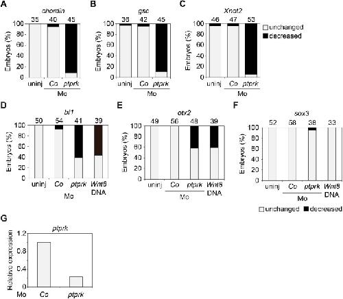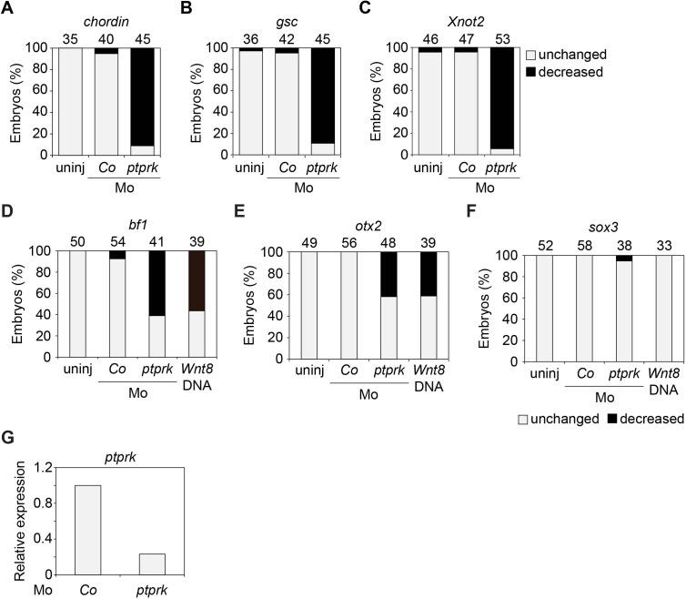 Figure 3 â figure supplement 1 | Ptprk regulates Spemann organizer function (A-F) Quantification of the expression of the indicated genes by whole mount in situ hybridization in Figure 3A-B. Top, number of embryos. (G) qRT-PCR analysis showing the knockdown efficiency of ptprk Mo in animal cap experiments in Figures 3C-E. Xenopus ptprk expression was normalized to odc. Expression in PPL and Co Mo injected embryos was set to 1. Data show one representative experiment of three independent experiments. |