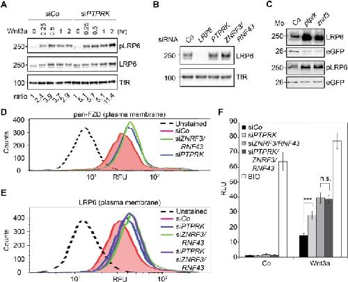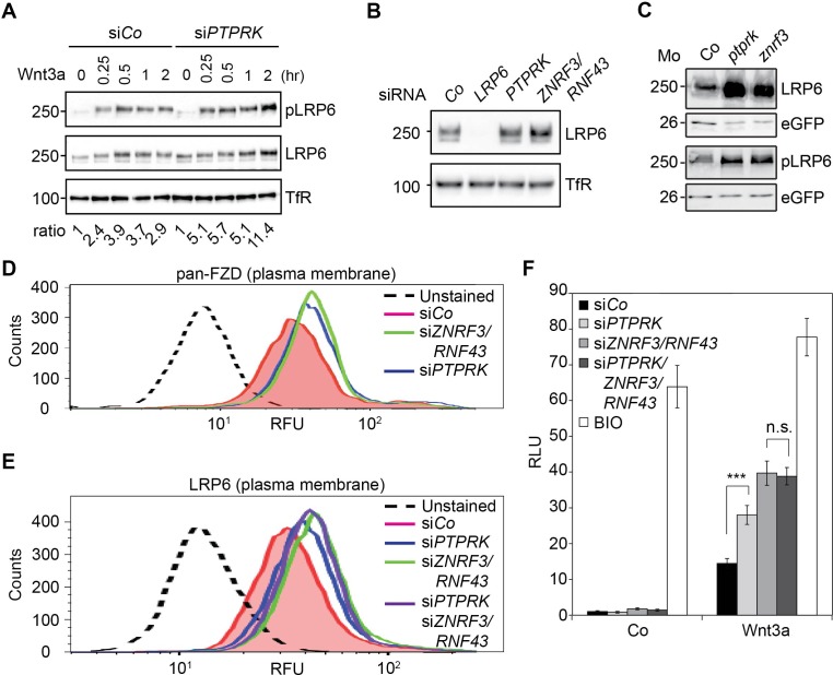 Figure 4. PTPRK reduces FZD and LRP6 surface levels via ZNRF3/RNF43.(A) Western blots analysis of membrane fractions from H1703 cells upon siRNA transfection. Cells were treated with Wnt3a for the indicated time and were analyzed. Ratio, phospho-LRP6 (pLRP6) levels normalized to control (transferrin receptor, TfR). Representative results from three independent experiments with similar outcome are shown. (B) Western blots analysis of membrane fractions from H1703 cells upon siRNA transfection. Transferrin receptor (TfR) served as loading control. Representative results from three independent experiments with similar outcome are shown. (C) Western blot analysis of LRP6 and phospho-LRP6 (pLRP6) in neurula (stage 18) embryos injected with LRP6 RNA, eGFP RNA and indicated Mo. eGFP served as an injection control. Data show one representative result from three independent experiments. (D) Flow cytometric analysis of cell surface Frizzled receptors (pan-FZD antibody) in H1703 cells upon siRNA knockdown of PTPRK or ZNRF3/RNF43. Only live cells were counted and dead cells were gated out by propidium iodide (PI) staining. Dashed line, unstained H1703 cells. RFU, relative fluorescence units. (E) Flow cytometric analysis of cell surface LRP6 in H1703 cells upon siRNA depletion of PTPRK, ZNRF3/RNF43 or combination of both. Only live cells were counted and dead cells were gated out by propidium iodide (PI) staining. Dashed line, unstained H1703 cells. RFU, relative fluorescence units. (F) Topflash reporter assay in H1703 cells upon transfection of indicated siRNAs. Cells were treated with Wnt3a with or without 20 μM BIO for 24 hr before measurement. (Mean ± SD, n = 3; ***p<0.001, n.s., not significant, student t-test). RLU, relative light.Figure 4âfigure supplement 1. PTPRK regulates LRP6 protein but not mRNA levels.(A) Quantification of relative LRP6 protein levels normalized to TfR in Figure 4B. (B) qRT-PCR analysis of LRP6 mRNA levels in H1703 cells transfected with indicated siRNAs. mRNA expression was normalized to GAPDH, and the level of LRP6 in siCo was set to 1. (C) Quantification of the protein levels of LRP6 (left) and phospho-LRP6 (pLRP6, right) shown in Figure 4C. Levels of LRP6 or phospho-LRP6 were normalized to eGFP and protein levels in Co Mo injected embryos were set to 1. (D) qRT-PCR analysis of ptprk and lrp6 mRNA levels in Co Mo or ptprk Mo injected neurula embryos (stage 18) in Figure 4C. The expression level in Co Mo injected embryos was set to 1. (E) qRT-PCR analysis showing the knockdown efficiencies of the indicated siRNAs in H1703 cells (related to Figure 4F). Statistics was performed with three independent experiments (Mean ± SD, *p<0.05, **p<0.01, ***p<0.001). |