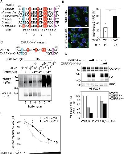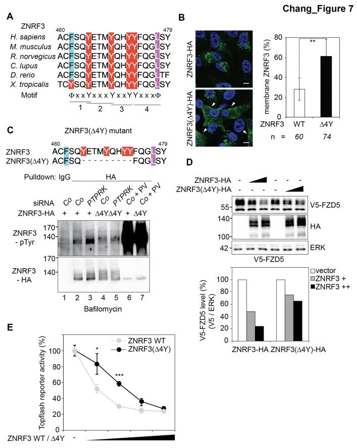 Figure 7. A "4Y" endocytic motif in ZNRF3 is regulated by PTPRK.(A) Multiple sequence alignment of ZNRF3 among different species. Y: Tyrosine, X: any amino acids, and Φ: hydrophobic bulky amino acids. (B) Subcellular localization by immunofluorescence microscopy (IF) of ZNRF3-HA or ZNRF3(Î4Y)-HA in H1703 cells with bafilomycin treatment overnight. Left, representative IF images. Arrowheads indicate membrane ZNRF3. Right, graph shows quantification of membrane ZNRF3 positive cells (Mean ± SD, **p<0.01, student t-test). The number of cells per condition is indicated at the bottom (n). IF data are pooled from two independent experiments. (C) Tyrosine phosphorylation of ZNRF3-HA or ZNRF3(Î4Y)-HA in H1703 cells upon siRNA transfection with bafilomycin treatment overnight. As a control, cells were treated with Na-pervanadate (PV, phosphatase inhibitor) for 30 min before harvest. Lysates were pulled down with anti-HA antibody or control IgG and subjected to Western blot analysis. (D) Western blot analysis of H1703 cells transfected as indicated. The graph below shows quantification of V5-FZD5 normalized to ERK. The level of V5-FZD5 without ZNRF3-HA transfection was set to 100%. A representative result from two independent experiments with similar outcomes is shown. (E) Topflash reporter assay in H1703 cells upon transfection of different amount of ZNRF3-HA or ZNRF3(Î4Y)-HA plasmids. All samples were Wnt3a treated for 24 hr before measurement. (Mean ± SD, n = 3; *p<0.05, ***p<0.001, student t-test). Topflash activity without ZNRF3 transfection was set to 100%. A representative result from three independent experiments with similar outcomes is shown.Figure 7âfigure supplement 1. The ZNRF3(4YF) mutant resists PTPRK regulation and shows reduced Wnt signal inhibition.(A) Tyrosine phosphorylation of the indicated Wt and mutant ZNRF3 constructs in H1703 cells upon siRNA transfection and bafilomycin treatment overnight. As control, cells were treated with Na-pervanadate (PV, phosphatase inhibitor) for 30 min before harvest. Lysates were pulled down with anti-HA antibody or control IgG and subjected to Western blot analysis. (B) Topflash reporter assay in H1703 cells upon transfection of different amount of the indicated Wt and mutant ZNRF3 plasmids. All samples were Wnt3a treated for 24 hr before measurement. (Mean ± SD, n = 3; **p<0.005, ***p<0.001, student t-test). Topflash activity without ZNRF3 transfection was set to 100%. A representative result from three independent experiments with similar outcomes is shown. |