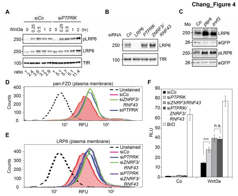Figure 4. PTPRK reduces FZD and LRP6 surface levels via ZNRF3/RNF43.(A) Western blots analysis of membrane fractions from H1703 cells upon siRNA transfection. Cells were treated with Wnt3a for the indicated time and were analyzed. Ratio, phospho-LRP6 (pLRP6) levels normalized to control (transferrin receptor, TfR). Representative results from three independent experiments with similar outcome are shown. (B) Western blots analysis of membrane fractions from H1703 cells upon siRNA transfection. Transferrin receptor (TfR) served as loading control. Representative results from three independent experiments with similar outcome are shown. (C) Western blot analysis of LRP6 and phospho-LRP6 (pLRP6) in neurula (stage 18) embryos injected with LRP6 RNA, eGFP RNA and indicated Mo. eGFP served as an injection control. Data show one representative result from three independent experiments. (D) Flow cytometric analysis of cell surface Frizzled receptors (pan-FZD antibody) in H1703 cells upon siRNA knockdown of PTPRK or ZNRF3/RNF43. Only live cells were counted and dead cells were gated out by propidium iodide (PI) staining. Dashed line, unstained H1703 cells. RFU, relative fluorescence units. (E) Flow cytometric analysis of cell surface LRP6 in H1703 cells upon siRNA depletion of PTPRK, ZNRF3/RNF43 or combination of both. Only live cells were counted and dead cells were gated out by propidium iodide (PI) staining. Dashed line, unstained H1703 cells. RFU, relative fluorescence units. (F) Topflash reporter assay in H1703 cells upon transfection of indicated siRNAs. Cells were treated with Wnt3a with or without 20 μM BIO for 24 hr before measurement. (Mean ± SD, n = 3; ***p<0.001, n.s., not significant, student t-test). RLU, relative light. |