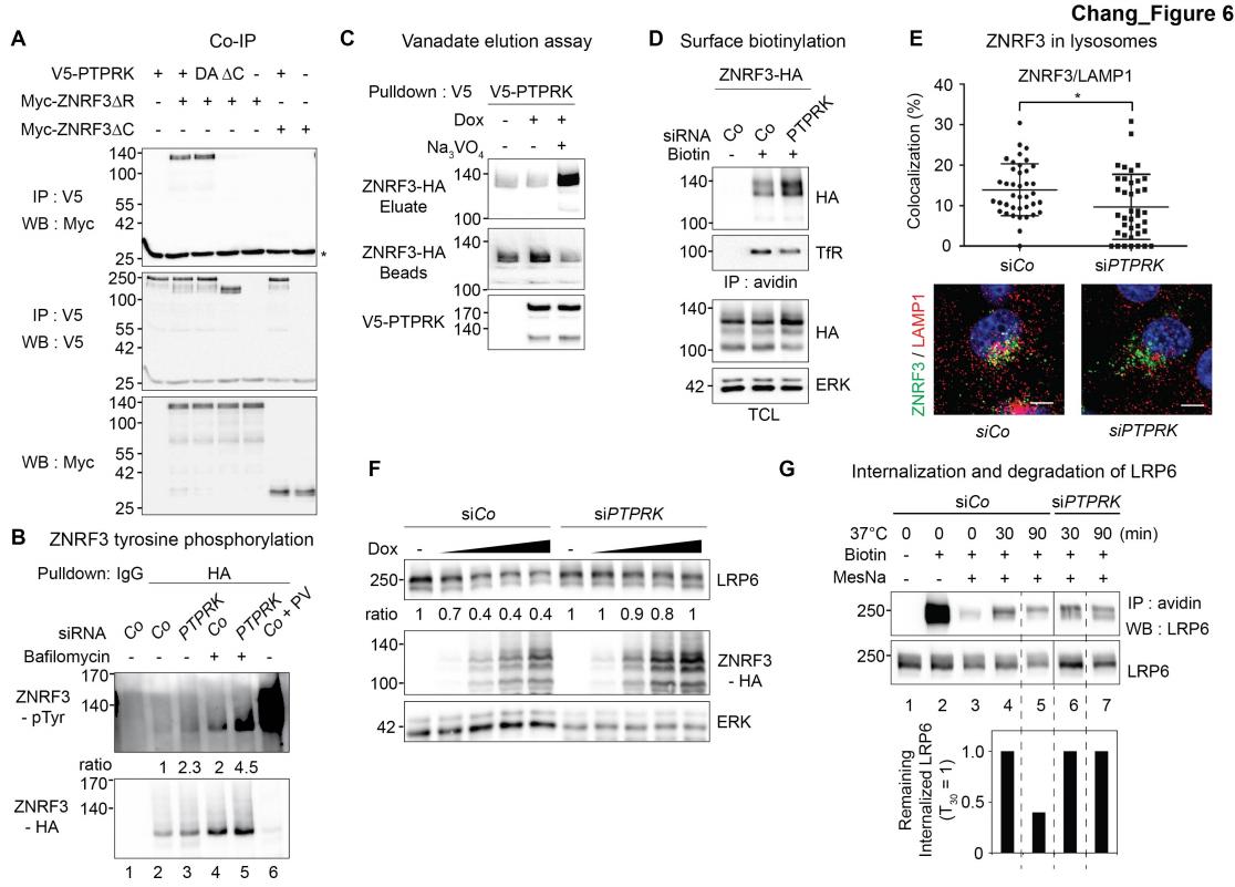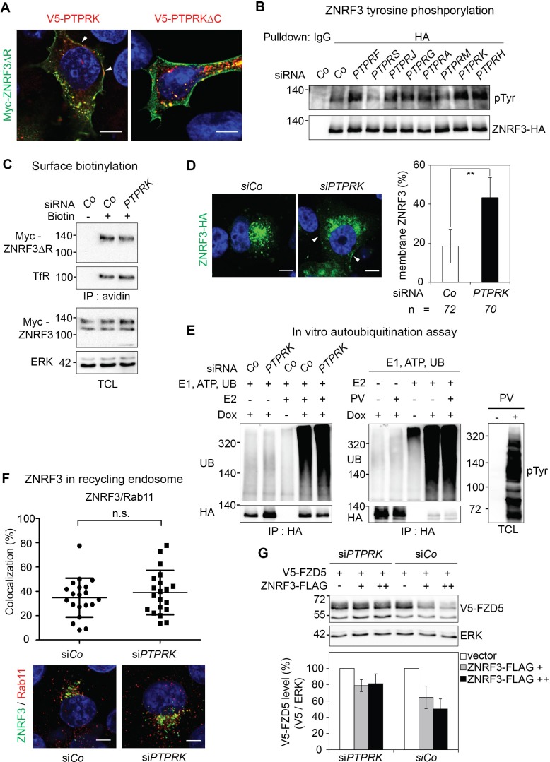 Figure 6 â figure supplement 1 | PTPRK does not regulate ZNRF3 recycling. (A) Immunofluorescence microscopy showing colocalization of Myc-ZNRF3-δRING (green) with V5- PTPRK or V5-PTPRK-δC (red). Arrowheads indicate colocalization of PTPRK but not PTPRK-δC with ZNRF3 at the plasma membrane. (B) Tyrosine phosphorylation of ZNRF3 in TetOn ZNRF3-HA H1703 cells upon siRNA transfection and bafilomycin treatment overnight. (C) Cell surface biotinylation assay performed in H1703 cells transfected with Myc-ZNRF3-δR upon PTPRK knockdown. After labeling surface protein with NHS-LC-LC-Biotin, lyates were pulled down with streptavidin beads and subjected to Western blot analysis. Transferrin receptor (TfR), loading control for avidin pull down; ERK, total cell lysate (TCL) control. A representative result from three independent experiments with similar outcomes is shown. (D) Immunofluorescence microscopy (IF) showing the localization of ZNRF3-HA (green) upon PTPRK knockdown. Left, representative IF images. Arrowheads indicate plasma membrane ZNRF3. Right, quantification of membrane ZNRF3 positive cells (mean ± SD, **P < 0.01, student t-test). The number of cells per condition is indicated at the bottom (n). (E) Ubiquitin Western blot of in vitro autoubiquitination assay for ZNRF3-HA upon PTPRK knockdown (left panel) or Na-pervanadate treatment (right panel) in TetOn ZNRF3-HA cells. After 48 h of Dox treatment and 72 h of PTPRK knockdown, immunoisolated ZNRF3 was incubated as indicated. Where indicated, cells were treated with 100 μM Na-pervanadate (PV) for 30 min before harvest. A representative result of two independent experiments with similar outcomes is shown. (F) Colocalization by immunofluorescence microscopy (IF) of ZNRF3 (Green) with Rab11 (recycling endosome marker, red) in Dox treated TetOn ZNRF3-HA H1703 cells upon siRNA treatment. Top, graph shows quantification of ZNRF3 colocalizing with LAMP1 (Mean ± SD, *P < 0.05, student t-test). Bottom, representative IF images. Colocalization data are pooled from two independent experiments. (G) Western blot analysis of H1703 cells transfected as indicated. The graph shows quantification of V5- FZD5 normalized to ERK from three independent experiments (Mean ± SE, student t-test). The level of V5-FZD5 without ZNRF3-HA transfection was set to 100%. |