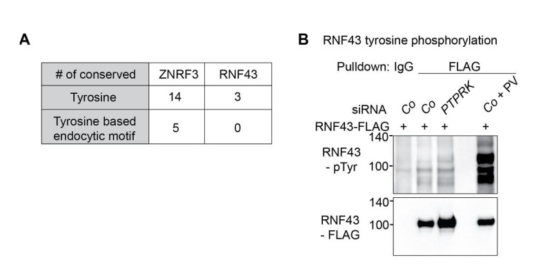 Author response image 3. siPTPRK does not affect tyrosine phosphorylation of RNF43.(A) Table showing the comparison of multiple sequence alignment result of ZNRF3 and RNF43 intracellular domain among different species including H. sapiens, M. musculus, R. norvegicus, C. lupus, D. rerio and X. tropicalis. (B) siPTPRK does not affect tyrosine phosphorylation of RNF43. Tyrosine phosphorylation of RNF43-FLAG in H1703 cells was analyzed in bafilomycin treated cells. As a control, cells were treated with Na-pervanadate (PV, phosphatase inhibitor) for 30 min before harvest. Lysates were pulled down with anti-FLAG antibody or control IgG and subjected to Western blot analysis. A representative result from two independent experiments with similar outcomes is shown. |