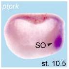 ptprk (protein tyrosine phosphatase receptor type K) gene expression in Xenopus tropicalis embryo, assayed via in situ hybridization, NF stage 30, lateral view, anterior left, dorsal up. |