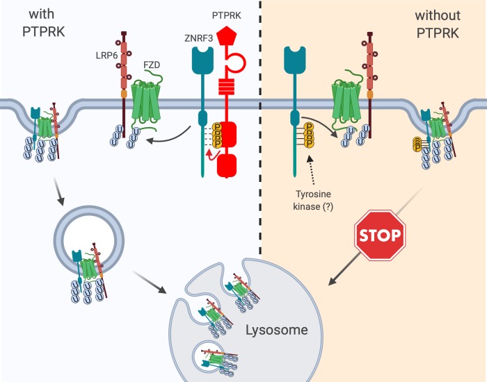 Figure 7 â figure supplement 2 | Model for PTPRK acting as Wnt inhibitor Left, ZNRF3 E3 ubiquitin ligase reaching the plasma membrane continuously co-internalizes Wnt receptors, targets them for lysosomal degradation and reduces Wnt signaling. An unphosphorylated 4-tyrosine (â4Yâ) motif serves as ZNRF3 internalization signal. The phosphatase PTPRK dephosphorylates the 4Y motif and promotes ZNRF3 lysosomal targeting along with Wnt receptors to reduce Wnt signaling. Right, in the absence of PTPRK an unknown tyrosine kinase(s) phosphorylat |