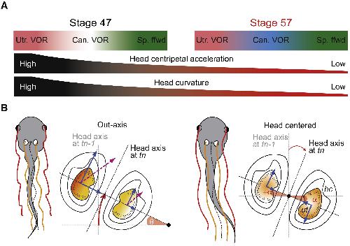 Locomotor maturation requires concurrent gaze stabilization improvement for maintaining visual acuity [1, 2]. The capacity to stabilize gaze, in particular in small aquatic vertebrates where coordinated locomotor activity appears very early, is determined by assembly and functional maturation of inner ear structures and associated sensory-motor circuitries [3-7]. Whereas utriculo-ocular reflexes become functional immediately after hatching [8, 9], semicircular canal-dependent vestibulo-ocular reflexes (VORs) appear later [10]. Thus, small semicircular canals are unable to detect swimming-related head oscillations, despite the fact that corresponding acceleration components are well-suited to trigger an angular VOR [11]. This leaves the utricle as the sole vestibular origin for swimming-related compensatory eye movements [12, 13]. We report a remarkable ontogenetic plasticity of swimming-related head kinematics and vestibular end organ recruitment in Xenopus tadpoles with beneficial consequences for gaze-stabilization. Swimming of older larvae generates sinusoidal head undulations with small, similar curvature angles on the left and right side that optimally activate horizontal semicircular canals. Young larvae swimming causes left-righthead undulations with narrow curvatures and strong, bilaterally dissimilar centripetal acceleration components well suited to activate utricular hair cells and to substitute the absent semicircular canal function at this stage. The capacity of utricular signals to supplant semicircular canal function was confirmed by recordings of eye movements and extraocular motoneurons during off-center rotations in control and semicircular canal-deficient tadpoles. Strong alternating curvature angles and thus linear acceleration profiles during swimming in young larvae therefore represents a technically elegant solution to compensate for the incapacity of small semicircular canals to detect angular acceleration components.