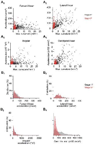 (A and B) Scatter plots (A) and relative distributions (B) of forward linear (A1 and B1), lateral linear (A2 and