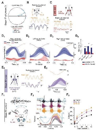(B and C) Representative examples of multiple cycles (B) and average (±SD, shaded area) over a single cycle (C) of swimming-related head and concurrent compensatory movements of the left (Le, green) and right (Ri, blue) eye at stage 47 (B1 and C1) and 57 (B2 and C2).