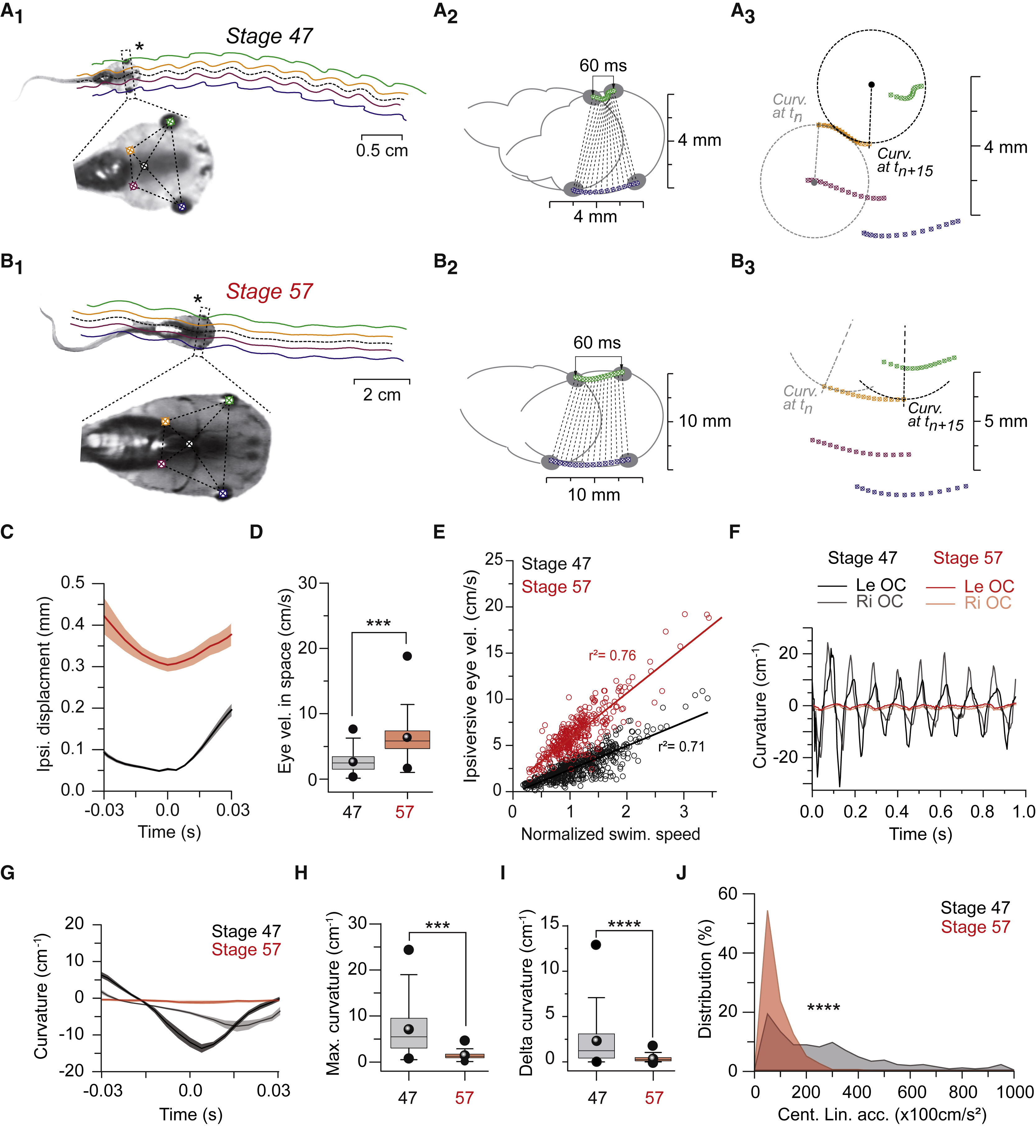 (A) Frame-by-frame motion trajectory of larval swimming at stage 47 (A1) and 57 (A2) obtained from high-speed videos.