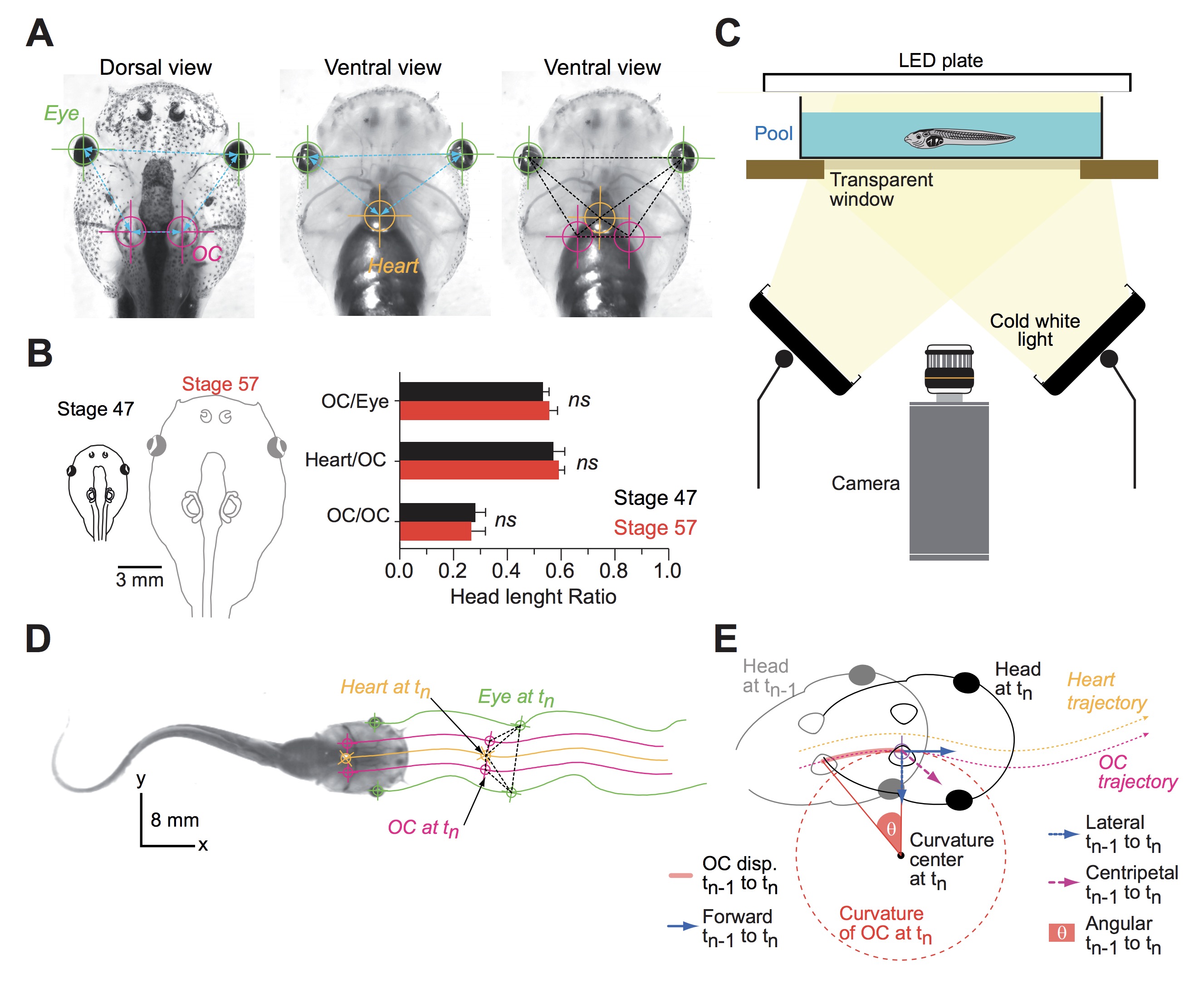 (B, C and D) Movement of the left (dark traces) and right (light traces) eye at stage 47 during horizontal rotation