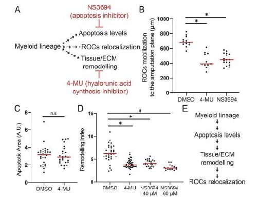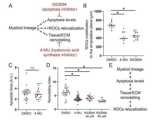 Fig 3. Sequential involvement of apoptosis, tissue remodelling and regeneration- organising- cells mobilisation following tail amputation. (A) Experimental setup for assessing the relationship between the cellular mechanisms controlled by amputation induced myeloid lineage activity. Cellular events downstream of myeloid lineage activity were assessed after drug treatments. NS3694 (apoptosis inhibitor) and 4-MU (hyaluronic acid synthesis inhibitor) were used to block apoptosis, and tissue remodelling, respectively. (B) ROCs relocalization levels at 1 dpa in DMSO control, or after 4-MU, or NS3694 treatment in regeneration-competent tadpoles. All samples were obtained from two biological replicates: DMSO n = 13; 4-MU n= 11; NS3694 n= 17. One-way ANOVA was used to assess statistical significance, red line denotes median, *p<0.001. (C) Apoptotic area at 1 dpa in DMSO or 4-MU treated regeneration-competent tadpoles. All samples were obtained from four biological replicates: DMSO n = 29; 4-MU n= 25. Student`s t-test was used to assess statistical significance, red line denotes median, *p<0.001. (D) Quantification of remodelling index at 1 dpa in, DMSO, 4-MU or NS3694 treatment in regeneration-competent tadpoles. All samples were obtained from at least 3 biological replicates: DMSO n = 32; 4-MU n: 43, NS3694 40 µM n= 26; NS3694 60 µM n= 18. One-way ANOVA was used to assess statistical significance, red line denotes median, *p<0.001. (E) Epistasis experiments suggest the myeloid lineage controls apoptosis levels which influences tissue/ECM remodelling through HA deposition and finally, ROCs relocalization. |