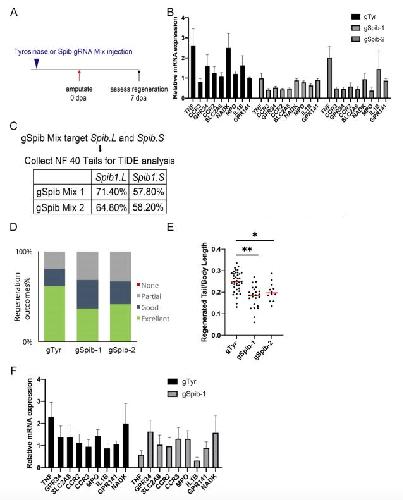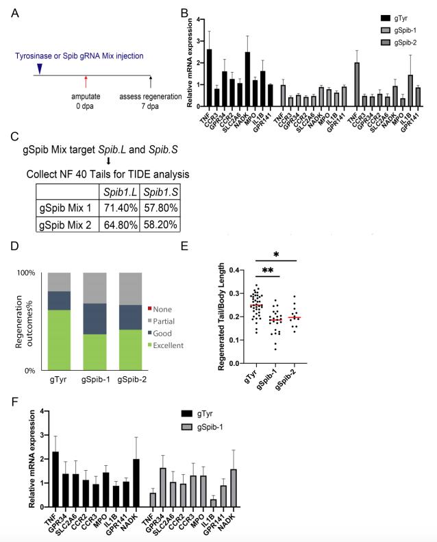 Fig S3. CRISPR/Cas9 mediated Spib knock-out decreases myeloid lineage gene expression and impairs regeneration. (A) Experimental design for generating F0 tadpoles with a defective myeloid lineage via CRISPR/Cas9 mediated Spib knock-out and for testing regeneration in regeneration competent tadpoles. Regeneration efficiency was assessed at 7 dpa. (B) Myeloid lineage gene expression was assessed by RT-qPCR in F0 tadpoles injected with guide RNAs targeting either Tyrosinase (gTyr) as control, or Spib (gSpib). Spib-1 and Spib-2 denotes two different guide RNA mixes. Samples were collected at the time of tail amputation. All values were normalized to guide RNAs against Tyrosinase injected sample. Guide RNAs targeting Spib were able to decrease myeloid lineage gene expression. n ⥠3 biological replicates for each gene expression quantification, error bars represents ±s.e.m.. (C) Guide RNA efficiencies were assessed via TIDE analysis. At least 10 tails of tadpoles injected with gRNAs targeting Tyrosinase or Spib mixes were used for TIDE. (D) Regeneration- outcomes at 7 dpa for guide RNA injected tadpoles. (E) Regeneration was assessed in individual tadpoles by comparing regenerated tail to body length ratio at the 7 dpa. All samples were obtained from at least three independent biological batches: gTyr n = 39; gSpib-1 n= 24; gSpib-2 n= 11. One-way ANOVA used to assess statistical significance, red line denotes median, *p<0.05, **p<0.001. Note that this measurement was carried out on the same data as in Fig S3D. (F) Myeloid lineage gene expressions were assessed by RT-qPCR in F0 tadpoles injected with guide RNAs targeting either Tyrosinase (as control), or Spib1. Spib-1 and Spib-2 denotes two different guideRNA mix. Samples were collected 7 day post tail amputation. All values were normalized to one sample of gTyr sample. GuideRNAs targeting Spib had no major difference in myeloid gene expression compared to gTyr control. n = 3 biological replicate for each gene expression quantification, and graphed, representing mean with ±s.e.m.. |