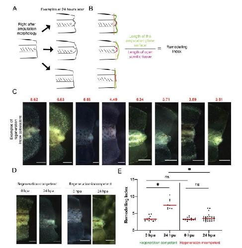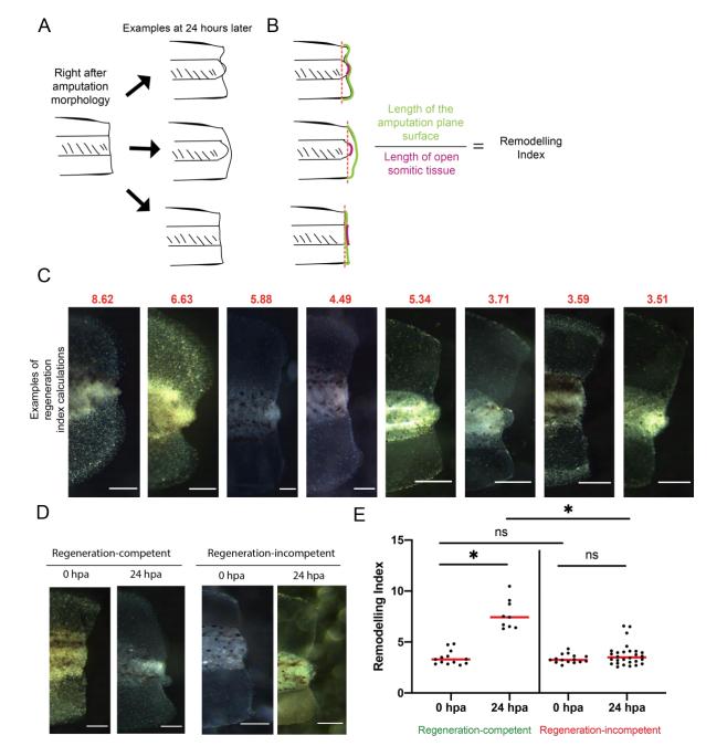 Fig S4. Remodelling index captures morphological differences between the amputation plane of regeneration-competent and -incompetent tadpoles. (A) Schematics for amputation plane morphology immediately after amputation (left), and examples at 24 hours post amputation. Upon amputation, the somitic region is exposed to the outside medium and present a rectangular shape. Fin regions do not show any inward curvatures towards the amputation plane. Within 24 hours, somitic regions undergo histolysis and muscle tissue degeneration (Beck et al., 2003), while fin cells from the ventral and dorsal sides of the tail start covering the amputation plane. In regeneration-incompetent tadpoles, limited changes are observed (right, bottom). (B) Ratio of the length of the amputation plane surface to length of open somitic region used to estimate âremodelling indexâ. (C) Examples of images with corresponding regeneration index scores. (D) Representative images of regeneration-competent and âincompetent tadpoles, 0-hour post amputation and 24 hours post amputations. Competent tadpole present extensive remodelling of the somatic and fin tissues. Scale bar= 250 µm. (E) Quantification of remodelling index for regenerationcompetent and âincompetent 0 hpa, and 24 hpa samples. All samples were obtained from at least two biological replicates: Regeneration-competent 0 hpa n= 15; Regeneration competent 24 hpa n= 9; Regeneration-incompetent 0 hpa n= 15; Regeneration-incompetent 24 hpa n= 28. One-way ANOVA used to assess statistical significance, red line denotes median, *p<0.05. |