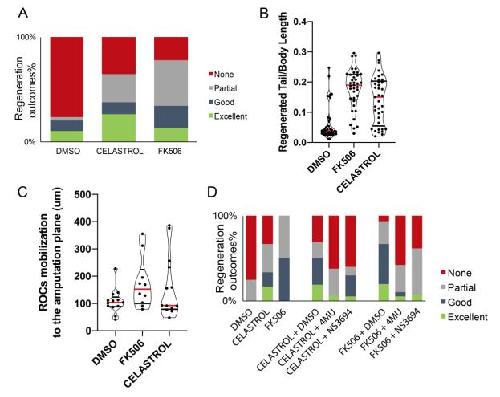Fig S8. Immune suppressing drugs FK506 and Celastrol rescue the no-regeneration phenotype. (A) Regeneration-outcomes at 7 dpa in FK506, or Celastrol treated tadpoles in regeneration incompetent tadpoles. All samples were obtained from five biological replicates: DMSO n=40; Celastrol n=37; FK506 n=37. (B) Regeneration was assessed in individual tadpoles by comparing regenerated tail to body length ratio at 7 dpa. Note that this measurement was carried out on the same data as in Fig 8A. (C) ROCs mobilisation initiates at 1 dpa in immune suppressing drugs treated regeneration-incompetent tadpoles. Quantification of ROCs relocalization at 1 day post amputation. All samples were obtained from two biological replicates: DMSO n = 13; FK506 n= 10; Celastrol n= 12. Red bar denotes the mean. (D) Immune suppressing drugs mediated rescue of regeneration requires apoptosis and tissue remodelling. Regeneration-outcome at 7 dpa in regeneration-incompetent tadpoles treated with FK506 or Celastrol either alone or in combination with inhibitor of tissue remodelling (4-MU to block HA pathway) or inhibitor of apoptosis (NS3694). Note that this measurement was carried out on the same data as in Fig 5D. |