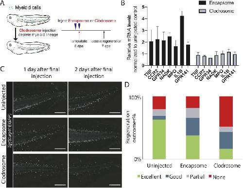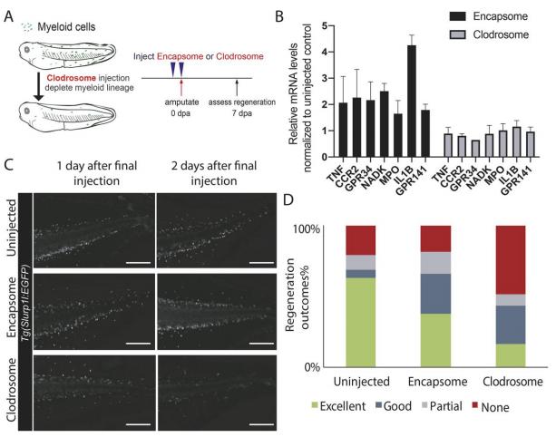 Fig 1. Depleting myeloid lineage impedes Xenopus tail regeneration. (A) Experimental design for assessing the effect of myeloid lineage depletion on regeneration. Regeneration-competent tadpoles were injected with either control (Encapsome), or clodronate containing lipids (Clodrosome) before tail amputation. Regeneration efficiency was assessed at 7 days post tail amputation (dpa). (B) Clodrosome injection decreases myeloid gene expression compared to Encapsome injection. Expression of myeloid lineage genes after Encapsome or Clodrosome injections were assessed by RT-qPCR analysis on amputated tails. All values were normalized to that of the Uninjected controls. n ⥠3 biological replicates for each gene expression quantification, error bars represent ±standard error of the mean (s.e.m.). (C) Representative images of Tg(Slurp1l:EGFP) tadpoles post Encapsome or Clodrosome injection. Decrease in Slurp1l:EGFP myeloid lineage signal is particularly seen at dorsal and ventral vein regions. Scale bar= 250 µM. (D) Regeneration outcomes at 7 dpa in uninjected, Encapsome or Clodrosome injected regeneration-competent tadpoles. Samples were obtained from three biological replicates: Uninjected n = 30; Encapsome n= 34; Clodrosome n= 46. |
