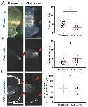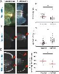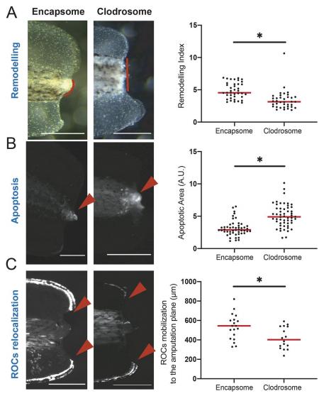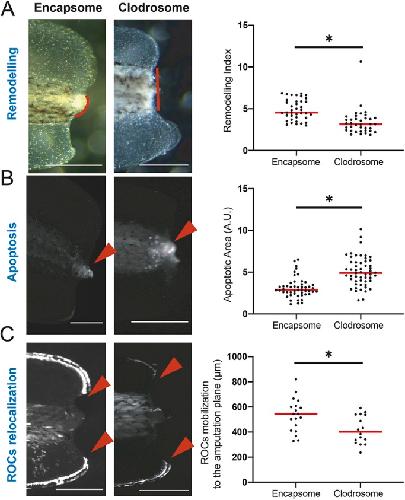 Fig 2. The myeloid lineage is required for tissue remodelling, reduction of apoptosis levels, and relocalization of regeneration-organizing-cells. (A) (Left) Representative images of remodelling events occurring at 1 dpa in Encapsome or Clodrosome injected regeneration-competent tadpoles. Red lines indicate the posterior somitic region. Post amputation histolysis and remodelling of tissue is impaired in Clodrosome injected tadpoles. Scale bar= 250 µm. (Right) Remodelling index quantification. All samples were obtained from at least three biological replicates: Encapsome n= 39; Clodrosome n= 37. Each dot represents an individual tadpole. Student`s t-test was used to assess statistical significance, the red line denotes the median, *p<0.001. (B) (Left) Representative images of apoptosis occurring at 1 dpa in Encapsome or Clodrosome injected regeneration-competent tadpoles. The red arrows indicate the location of the Lysosensor signal used to report apoptosis. Scale bar= 250 µm. (Right) Apoptotic area quantification. All samples were obtained from at least three biological replicates: Encapsome n= 49; Clodrosome n= 53. Student`s t-test was used to assess statistical significance, red line denotes median, *p<0.001.A.U.: arbitrary unit. (C) (Left) Representative images of ROCs relocalization at 1 dpa for Encapsome or Clodrosome injected regeneration-competent tadpoles. The 7pbin:EGFP transgenic line was used to assess ROCs relocalization. Red arrows show the location of the leading ROC cells. Scale bar= 250 µm. (Right) ROCs relocalization quantification. All samples were obtained from at least three biological replicates: Encapsome n= 19; Clodrosome n= 16. Student`s t-test was used to assess statistical significance; red line denotes median. *p<0.001. |