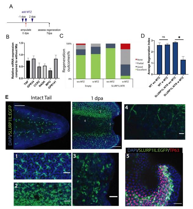 Fig S2. Genetic ablation of Slurp1l expressing cells decreases regeneration. (A) Experimental design for ablating Slurp1l expressing myeloid cells using NTR/MTZ method. F0 transgenic tadpoles that express NTR under the control of Slurp1l promoter were generated. MTZ was added one day before, immediately after, and two-day after amputation in regeneration-competent tadpoles. Regeneration efficiency was assessed at 7 dpa. (B) NTR/MTZ mediated ablation of Slurp1 expressing cells decreases myeloid cell lineage expression. Myeloid lineage gene expressions were assessed by RT-qPCR in Slurp1l:NTR expressing F0 tadpoles 1 day post MTZ treatment. Tail samples were collected at the time of amputation. All values were normalized to that of the controls without MTZ treatment. n ⥠3 biological replicates for each gene expression quantification, error bars represent ±s.e.m.. ttest was used to assess statistical significance; *p<0.001.(C) Regeneration-outcomes at 7 dpa following Slurp1l mediated NTR/MTZ myeloid cell ablation. All samples were obtained from three independent biological batches: Empty without (wo) MTZ n = 31; Empty with (w) MTZ n= 34; Slurp1l:NTR wo MTZ n= 47; Slurp1l:NTR w MTZ n= 44.(D) Average regeneration index at 7 dpa following Slurp1l mediated NTR/MTZ myeloid cell ablation. n = 3 biological replicates for each sample, error bars represent mean ±s.e.m. Student`s t-test was used to assess statistical significance, *p<0.05. Note that this measurement was carried out on the same data as in Fig 2C. (E) Slurp1l promoter gets activated upon amputation in non-myeloid lineage cells. (Left) In an intact tail Tg(Slurp1l:EGFP) transgenic line labels cells that resemble macrophages. (Middle) Upon tail amputation at 1 dpa Tg(Slurp1l:EGFP) signal is also seen in non-myeloid lineages. (Right) Examples of cells with different morphologies that are labelled by Slurp1l promoter. All samples were stained against EGFP (green), and DAPI (blue). Number 5 is also stained for TP63. ROCs reside at the edges of TP63 positive epidermal cells, and Slurp1l signal can also be seen in these cells. Scale bar= 250 µm for intact tail and 1 dpa image, 50 µm for zoomed images |