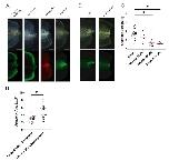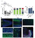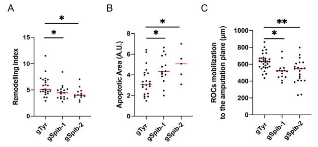Fig S6. CRISPR/Cas9 Spib knock-out impairs relocalization of regeneration-organizing cells, apoptosis levels, and tissue remodelling (A) Quantification of ROCs relocalization at 1 day post amputation in regeneration-competent gTyr control and gSpib injected tadpoles. All samples were obtained from four independent biological batches: gTyr n= 39; gSpib-1 n= 37; gSpib-2 n=20. One-way ANOVA used to assess statistical significance, red line denotes median. *p<0.05, **p<0.001. (B) Quantification of apoptosis levels at 1 day post amputation in regeneration-competent gTyr control and gSpib injected tadpoles. All samples were obtained at least from two independent biological batches except gSpib-2 was obtained from one batch: gTyr n= 21; gSpib-1 n= 14; gSpib-2 n=5. Oneway ANOVA used to assess statistical significance, red line denotes median. *p<0.05. (C) Quantification of remodelling index for the samples at 1 day post amputation in regeneration competent gTyr control and gSpib injected tadpoles. All samples were obtained from two biological replicates: gTyr n= 24; gSpib-1 n= 17; gSpib-2 n=13. One-way ANOVA used to assess statistical significance, red line denotes median, *p<0.05. |