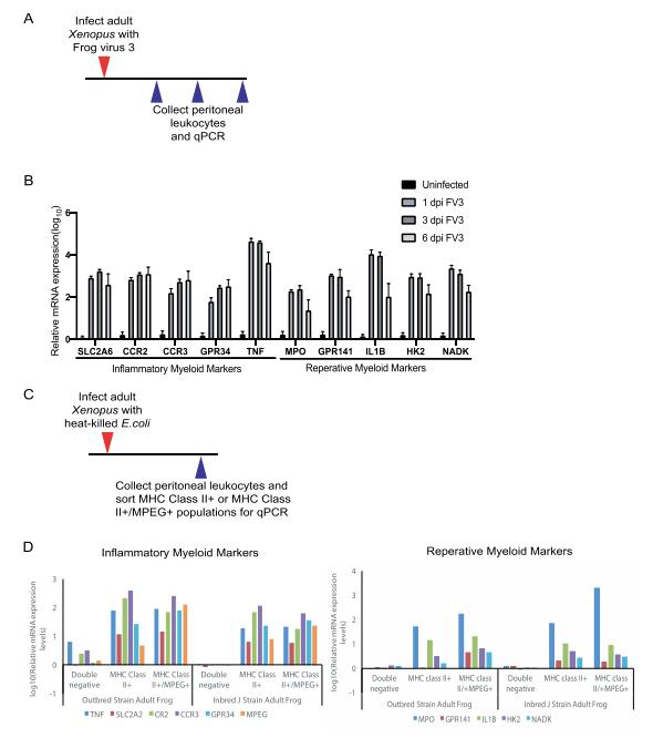 Fig S7. Adult X. laevis frogs infected with the ranavirus FV3 or stimulated with heatshock killed bacteria upregulates inflammatory and reparative myeloid gene expression in peritoneal leukocytes. (A) Experimental design for assessing the gene expression of different myeloid clusters upon Frog virus 3 infection (Large double strand DNA iridovirus). (B) Myeloid lineage gene expressions were assessed 1, 3, 6 days post-FV3 infection in peritoneal leukocytes. Inflammatory and reparative myeloid marker genes were enriched upon infection. (C) Experimental design for assessing the gene expression of different myeloid clusters of elicited peritoneal macrophages upon heat-killed E. coli stimulation. MHC Class II+, MHC Class II+/MPEG+, or double negative populations were sorted by flow cytometry from peritoneal leukocytes and tested for myeloid gene expressions. (D) Myeloid lineage gene expressions were assessed 3 days post-elicitation of in peritoneal macrophages by heat-killed E. coli. (Left) Myeloid 1 and (Right) Myeloid 2 cluster genes are enriched upon infection. |