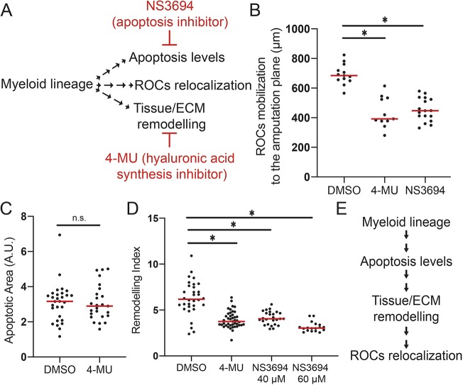 Fig. 3. Sequential involvement of apoptosis, tissue remodelling and regeneration-organizing cell mobilization following tail amputation. (A) Experimental setup for assessing the relationship between the cellular mechanisms controlled by amputation-induced myeloid lineage activity. Cellular events downstream of myeloid lineage activity were assessed after drug treatments. NS3694 (apoptosis inhibitor) and 4-MU (hyaluronic acid synthesis inhibitor) were used to block apoptosis, and tissue remodelling, respectively. (B) ROC relocalization levels at 1â dpa in DMSO control, or after 4-MU or NS3694 treatment in regeneration-competent tadpoles. All samples were obtained from two biological replicates: DMSO n=13; 4-MU n=11; NS3694 n=17. One-way ANOVA was used to assess statistical significance; *P<0.001. (C) Apoptotic area at 1â dpa in DMSO- or 4-MU-treated regeneration-competent tadpoles. All samples were obtained from four biological replicates: DMSO n=29; 4-MU n=25. Student's t-test was used to assess statistical significance; *P<0.001. n.s., not significant. A.U., arbitrary unit. (D) Quantification of remodelling index at 1â dpa in DMSO-, 4-MU- or NS3694-treated regeneration-competent tadpoles. All samples were obtained from at least three biological replicates: DMSO n=32; 4-MU n: 43, NS3694 40â µM n=26; NS3694 60â µM n=18. One-way ANOVA was used to assess statistical significance; *P<0.001. In B-D, each dot represents individual tadpoles; red line denotes median. (E) Epistasis experiments suggest that the myeloid lineage controls apoptosis levels, which influence tissue/ECM remodelling through HA deposition and, finally, ROCs relocalization. |