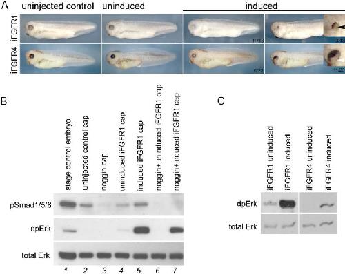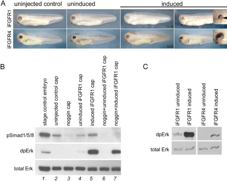 Panel (A) compares the appearance of control uninjected tailbud stage embryos and embryos injected into the two dorsoâanimal blastomeres at the eightâcell stage with 20 pg ifgfr1 or ifgfr4 mRNA cultured in the absence (uninduced) or presence of 1 µM AP20187 from stage 10.5 (induced). Higher magnification images of disrupted eye development are shown inset. Black arrow indicates missing lens. White arrow indicates disrupted pigmentation in the retina. (B) Western blot showing levels of phosphoâSmad1, 5, 8 (pSmad1/5/8), diphosphoâERK (dpERK) and total ERK animal cap explants at early neurula stage 15. Explants were taken from control uninjected embryos and embryos injected with 20 pg ifgfr1 mRNA or 50 pg noggin mRNA or coinjected with 20 pg ifgfr1 mRNA and 50 pg noggin mRNA. Explants from embryos injected with ifgfr1 were cultured in the absence (uninduced) or presence of 1 µM AP20187 from stage 10.5 (induced). (C) Western blot analysing levels of diphosphoâERK (dpERK) and total ERK levels animal cap explants from embryos injected with 20 pg ifgfr1 mRNA or ifgfr4 mRNA. Explants were cultured in the absence (uninduced) or presence of 1 µM AP20187 from stage 10.5 (induced) for 3 h.