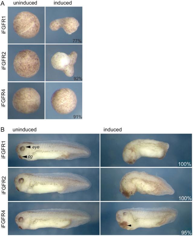 Panel (A) compares the appearance of animal caps from embryos injected with 20pg ifgfr1, ifgfr2 or ifgfr4 mRNA ± 1 µM AP20187. AP20187 treatments occurred from blastula stage 8 until late neurula stage 18. Percentages of explants from a representative experiment exhibiting the presented phenotype are indicated, ifgfr1, n = 9, ifgfr2 n = 12, ifgfr4, n = 11. Panel (B) compares the appearance at the tailbud stage of embryos injected with 20pg ifgfr1, ifgfr2 or ifgfr4 mRNA (±1 µM AP20187). AP20187 treatment was continuous from gastrula stage 10.5. Percentages of embryos from a representative experiment exhibiting the presented phenotype are indicated, iFgfr1, n = 20, iFgfr2 n = 15, iFgfr4, n = 20.