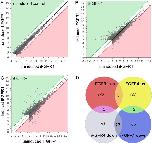 Scatterplots of log2 expression gene expression levels in neuralised animal cap explants generated from RNAâseq analysis data. Data were filtered with a cutâoff to exclude identified gene models with expression levels <30 (FKPM). Data points in the white zone, proximal to the black line (y = x) have less than twofold change in expression. Data points in the green zone have a more than twofold increase in expression relative to control (xâaxis). Data points in the red zone indicate more than twofold decrease in expression relative to control. Panel (A) compares gene expression in explants from embryos injected with 20 pg ifgfr1 or ifgfr4 mRNA in the absence of AP20187 treatment (uninduced). Panels (B) and (C) compare gene expression in explants from embryos injected with 20 pg ifgfr1 (B) or ifgfr4 mRNA (C) cultured in the absence (uninduced) or presence of 1 µM AP20187 from stage 10.5 for 3 h (induced). Panel (D) is a Venn diagram showing the overlap of gene sets up and down regulated by more than or equal to twofold following activation of iFgfr1 and iFgfr4 signalling in neuralised animal caps explants.