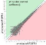 Scatterplots of log2 gene expression levels in late gastrula stage 13 embryos were generated using the Affymetrix microarray platform. Data were filtered with a cutâoff to exclude array features with expression levels <50. Data points in the white zone proximal to the black line (y = x) have less than twofold change in expression. Data points in the green zone have more than twofold increase in expression relative to control (xâaxis). Data points in the red zone indicate more than twofold decrease in expression relative to control. Panel (A) compares gene expression in control uninjected embryos and uninjected embryos treated with 1 µM AP20187 from early gastrula stage 10.5. Panel (B) compares gene expression in embryos injected with 20pg ifgfr1 or ifgfr2 mRNA in the absence of AP20187 treatment (uninduced). Panels (C) and (D) compare gene expression in embryos injected with either 20pg iFgfr1 (C) or iFgfr2 mRNA (D) cultured in the absence (uninduced) or presence of 1 µM AP20187 from stage 10.5 (induced). Panel (E) is a Venn diagram showing the overlap of the gene sets upâ and downregulated by more than or equal to twofold following activation of iFgfr1 and iFgfr2 signalling during gastrula stages.