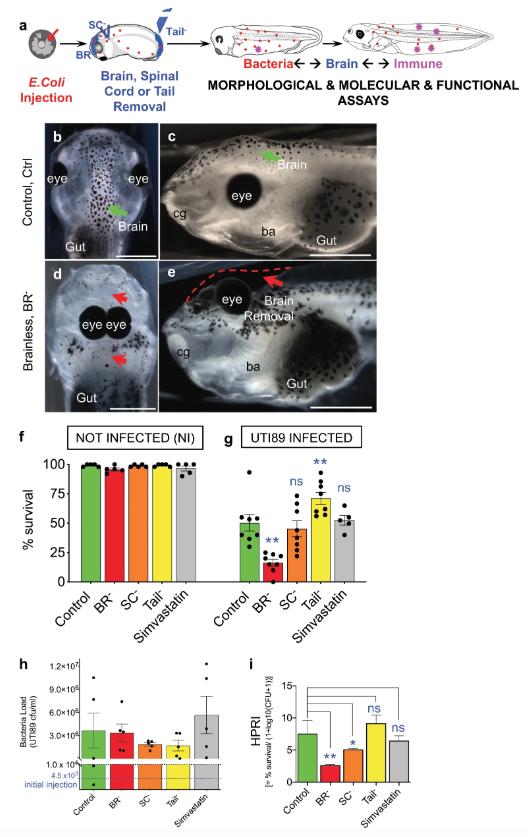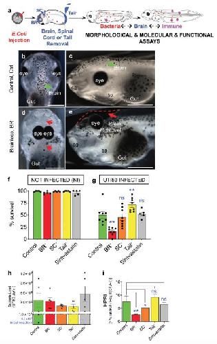 Fig. 1: The presence of a brain protects against systemic infection in Xenopus embryos. a) One day after fertilization (early- to mid-gastrula or stage 12), Xenopus embryos were microinjected with the pathogenic bacteria E. coli UTI89. The next day, surgeries were performed for removal of the brain (brainless or BRâ embryos), a piece of cervical spinal cord (SCâ embryos) or the tail bud (Tailâ embryos). Embryos were collected for morphological and molecular analysis during the next three days post-surgery. The bacterial load is represented in red. bâe) Dorsal (left column) and lateral (right column) views of st. 48 embryos belonging Control or Intact (Ctrl; b, c) vs. Brainless (BRâ; d, e) experimental groups. Green and red arrows point, respectively, the control or correct vs. aberrant morphologies after surgery removal. Eyes, gut and branchial arches (ba) are indicated for reference. Left: rostral is up. Right: rostral is left, dorsal is up. Rostral is left and dorsal is up. Scale barâ=â500âμm. f, g) Survival rates (plotted as percentage, %) of each experimental group per each infection condition: without E. coli infection or not-infected animals (NI; f, one-way ANOVA Pâ>â0.05) vs. E. coli UTI89 infected animals (UTI, evaluated four days after infection; g, one-way ANOVA Pâ<â0.01). Data represent the mean and S.D. of, at least, five independent replicates. Each replicate is shown by one dot. h) Bacteria load measured and plotted as colony forming units per milliliter (cfu/ml) in independent embryos (dots) belonging each experimental group or surgery condition. Alive embryos were harvested for analysis 48âh after infection. Initial bacteria load or number of bacteria injected (average of three independent replicates) at tâ=â0 is plotted as a blue-dashed line. One-way ANOVA Pâ>â0.05. i) Host-Pathogen Response Index (HPRI)â=â% survival/(1â+âlog10(CFUâ+â1)), for each experimental group, as a metric of tolerance. Data represent the mean and S.D. of five independent embryos. One-way ANOVA Pâ<â0.01. g, i) P values after post hoc Bonferroni comparisons are indicated as **Pâ<â0.01, *Pâ<â0.05, ns Pâ>â0.05. See also Supplementary Fig. S1. |