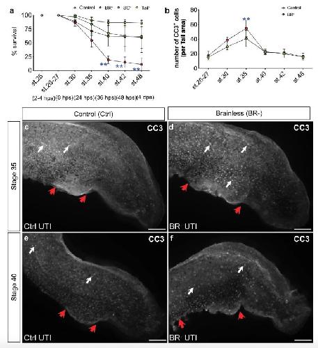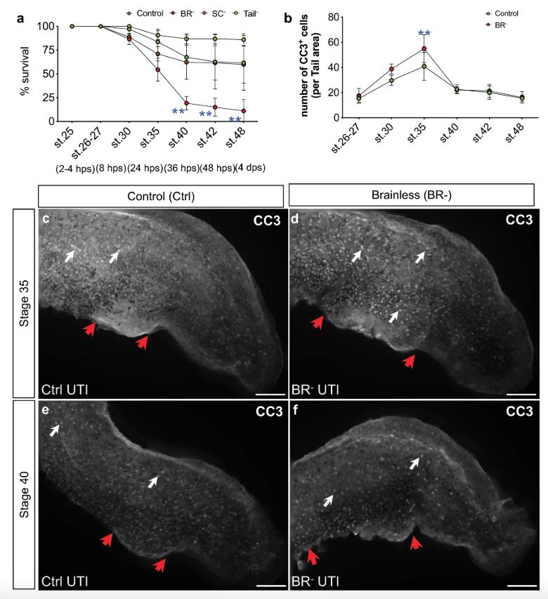 Fig. 2: The presence of a brain protects against infection-induced death, which is more severe during the first 48âh post infection. a) Longitudinal assay, scoring survival rates after infection for Control (Ctrl, green), Brainless (BRâ, red), Spinal Cord Resection (SCâ, orange) and Tailless (Tailâ, yellow) embryos at 2â4âh post-surgery (hps; corresponding to st. 26â27), 8âhps (st. 30), 24âhps (st. 35), 36âhps (st. 40), 48âhps (st. 42) and the end stage-48 time point (4 days ps). Data represent the mean and S.D. of three independent replicates. bâf) Number (b) and expression pattern (câf) of apoptotic cells (positively reacted against Cleaved Caspase-3 Asp175 antibody; CC3) in Ctrl (green) and BRâ (red) animals at the same longitudinal period than (a). Data represent the mean and S.D. of, at least, ten embryos coming from three different replicates. câf) Lateral views after CC3 immunofluorescence of UTI-infected Ctrl (c, e) and BRâ (d, f) embryos at st. 35 (c, d) and st. 40 (e, f). White arrows point CC3-expressing cells; red arrows indicate damage related to the infection along the gut area. Rostral is left and dorsal is up. Scale barâ=â250âμm. a, b) Two-way ANOVA Pâ<â0.01. P values after post hoc Bonferroni comparisons are indicated as **Pâ<â0.01. |