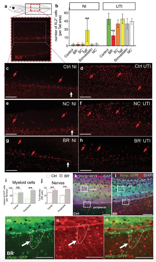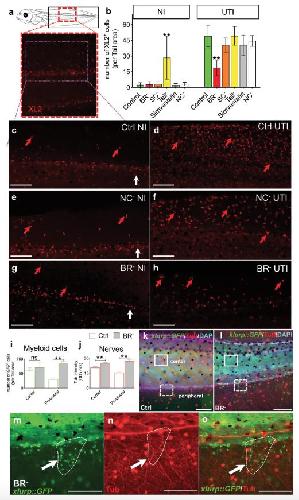 Fig. 4: The absence of early brain affects number and patterning of myeloid cells, distributed in proximity to the aberrant neural network. aâh) XL2 immunofluorescence to label leukocytes in uninfected (NI) and infected (UTI) embryos belonging Control (Ctrl, green), Brainless (BRâ, red), Spinal Cord Resection (SCâ), Tailless (Tailâ), Simvastatin-treated, and Neural Crest ablation (NCâ) groups. a) Drawing of a late-staged Xenopus embryo. Black rectangle indicates the tail area for counting. Magenta-dashed line outlines the region showed in (c)â(h). b) Number of XL2+ cells (normalized to the area) per each group and condition. câh) Lateral views of Ctrl (c, d), NCâ (e, f), and BRâ (g, h); NI (c, e, g) vs. UTI (d, f, h) embryos. Red arrows point XL2+ cells. White arrows point the posterior region of the central blood vessels. i, j) Number of myeloid cells (i) and acetylated alpha-tubulin (Tub) optical density (OD; j) per each tail region for Ctrl (white), and BRâ (gray) st. 46â48 embryos. kâo) Lateral views of xlurp::GFP Ctrl (k) and BRâ (l) embryos after Tub immunofluorescence. GFP+ myeloid cells are green, Tub+ nerves are red, nuclei are blue after DAPI staining. Differences in tail morphology for BRâ animals (deviating the normal body axis (l) with respect to Ctrl (k)) are due to developmental muscle mispatterning occurring when brain is absent. Two independent tail regions were counted: center (occupied by the myotomes; solid-white line) and peripheral (dorsal and ventral lateral fins; dashed-white line). Counts were made at the same region of the animals (e.g., at the same somite level). mâo) Details from (l), white-dashed square. White arrows indicate positive elements at the same point on the three images. Dashed-white line circle an area within scattered groups of immune cells lying in proximity to the highly disorganized neural networks. b, i, j) Data represent the mean and SD of, at least, ten different embryos, from different replicates, per each group and condition. Significant P values after post hoc tests are indicated as **Pâ<â0.01, ns Pâ>â0.05. Images: rostral is left, dorsal is up. Scale barâ=â250âμm. See also Supplementary Fig. S3. |