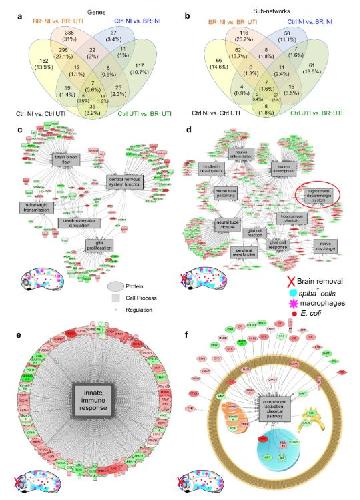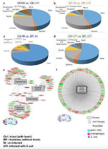 Supplementary Figure S4. Gene networks and cell processes unique to infection in presence or absence of a brain during development. aâd) Pie chart of the functional classification of the pathways exclusively regulated after infection in Control animals (a), after infection in BRâ animals (b), after brain removal without infection (c), and between infected Ctrl and infected BRâ embryos (d). e) Upregulation of bacteria-related genes induced by infection in brainless animals. These networks were up-regulated by 20%. f) Innate immune response after infection in intact (or developed with a brain) animals. This pathway responds 11% less in presence of a brain than it does in absence of a brain (see Fig. 6c). Green = down gene, Red = up gene. Complete data are presented in Supplementary Data 1. All measured genes found in a pathway are located in Supplementary Data 2. |