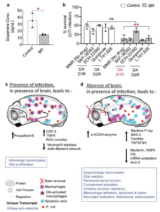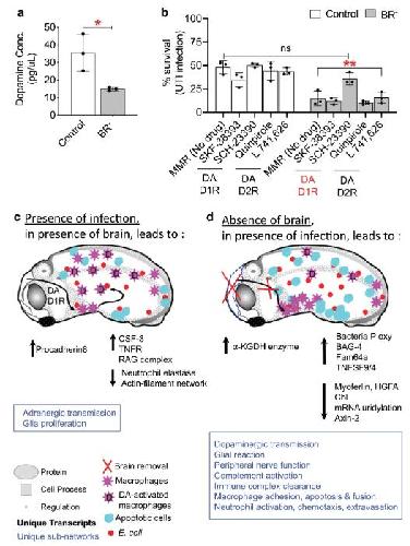 Fig. 6: Functional assays demonstrate a role for dopamine signaling in the protective effects of the brain on immune response. a) Dopamine concentration (in pg/μL) in infected Control (Ctrl, white) and Brainless (BRâ, gray) embryos at early stage 35, measured by liquid chromatographyâmass spectrometry (LCâMS/MS). Unpaired t-test *Pâ<â0.05. b) Survival rates (in percentage) of Ctrl (white) and BRâ (gray) infected embryos after pharmacological treatment with drugs targeting the type-1 or type-2 family of dopamine (DA) receptors (D1R, D2R). Two-way ANOVA Pâ<â0.01; P values after Bonferroni post hoc test are indicated as **Pâ<â0.01, ns Pâ>â0.05. a, b) Data represent the mean and S.D. of three independent replicates of 30 embryos. Each replicate is shown by one dot. See also Supplementary Fig. S6. c, d) Drawings represent the morphological and molecular events occurs in response to infection, in presence (c) or absence (d) of brain. Unique neural- and immune-related pathways are indicated in blue. Upregulation and downregulation of transcripts are indicated in black. E. coli is represented by red circles; apoptotic cells are represented by cyan circles; mmp7+ cells (early macrophages) are represented by pink stars; dopamine-activated macrophages are represented with a D on the pink star. Complete list of genes is presented in Supplementary Data 1. Greenâ=âdown gene, Redâ=âup gene. All measured genes found in a pathway are located in Supplementary Data 2. |