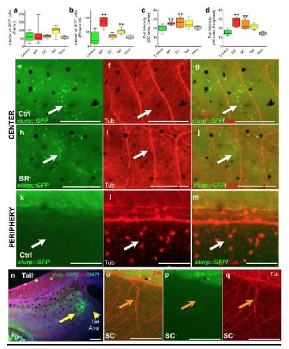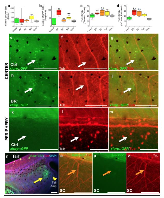 Supplementary Figure S3. Number and distribution of myeloid precursors (xlurp+) respect to peripheral nerve network (Tub+ fibers) in Control (Ctrl), Brainless (BRâ), Spinal-Cord resection (SCâ) and Tailless (Tailâ) embryos. aâd) Number of GFP+ cells (normalized to the area; a,b) and peripheral nerve intensity (measured as Tub OD; c, d) for st. 48 xlurp::GFP Control, BRâ, SCâ, Tailâ and Simv groups. P<0.01 for Kruskal-Wallis test. P values after post-hoc Dunn test, when compared to Ctrl group, is indicated as ** P<0.01. Data represent the mean and S.D. of, at least, ten embryos from three independent replicates. eâm) High-magnification images of center (e-j) and peripheral (kâm) tail areas in Control (eâg, kâm) and BRâ (hâj) xlurp::GFP embryos. Left column shows GFP+ myeloid cells, middle column shows neural network in red and right column shows co-location of immune cells and nerves. White arrows indicate positive elements at the same point on the three images of a row. nâq) Low-magnification lateral views of xlurp::GFP st. 48 Tailâ (n) and SCâ (o-q) embryos after whole-mount immunofluorescence with acetylated alpha-tubulin (Tub, red), showing the myeloid cells (GFP+, green), the neural network (Tub+, red), and the co-location for immune cells and nerves (nuclei are blue after DAPI staining in N). Yellow arrows in n indicate accumulation of immune cells at the bud or amputation plane. Orange arrows in o-q indicate the same point on the three images, noting an aberrant sprouted neural network (red) but without parallel ectopic pattern for macrophages (green; as detected in BRâ animals, compare to Fig. 4m-o). All: Rostral is left, dorsal is up; scale bar = 250 μm. |