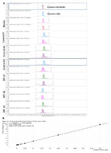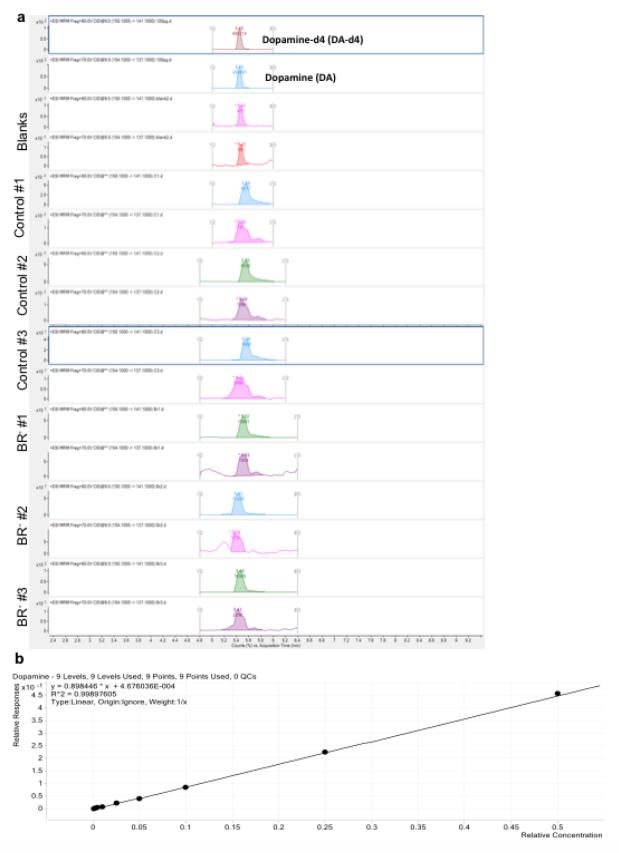 Supplementary Figure S6. Quantitative LC/MS/MS Analysis of Dopamine (DA) in Control (Ctrl) and Brainless (BR–) Xenopus embryos. a) Chromatogram of DA, its metabolite DA-d4 and labelled versions from wholemount embryos homogenate. b) Standard curve used for DA quantification, r2=0.99897605. X-axis is concentration (μM) and Y-axis if for relative response of DA corrected by its internal standard (DA-d4). |