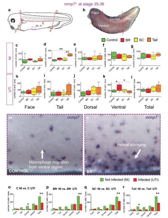 Fig. 3: The absence of the brain during development affects the migration of macrophages in response to infection. a, b) Drawing of (a) and image after in situ hybridization (ISH) for mmp7+ (b) of one st. 35 Xenopus embryo indicating the landmarks or reference points (1â6) for the body subdivision in the four independent areas for quantification (see Methods for details). Dashed-purple line square indicates the area shown in m, n inserts. Rostral is left and dorsal is up. câl) Quantification of number of mmp7+ cells in not-infected (NI, câg) and infected (UTI, hâl), belonging each experimental group: Control (Ctrl, green), brainless (BRâ; red), spinal cord resection (SCâ; yellow) and Tailless (Tailâ; orange). Values for normalized number of mmp7+ cells are plotted per each region and group: face (c, h), tail (d, i), dorsal (e, j), and ventral (f, k) to detect distribution and migration patterns. Total (g, l) is the sum of the four regions. One-way ANOVA P value showed significance for (d) (Pâ<â0.01) and (k) (Pâ<â0.05). m, n) High-magnification images showing detail of ventral region (purple square in (a)) with mmp7-positive cells in a Control (m) vs. Brainless (n) embryos. VBI: Ventral Blood Islands or primitive hematopoietic organ. oâr) Number of mmp7-positive myeloid cells (normalized to the area) in not-infected (green) vs. infected (red) embryos belonging Ctrl (o), BRâ (p), SCâ (q), and Tailâ (r) groups. Counts were done on four independent regions of the whole animal body (plus the summation): face, tail, dorsal and ventral areas. Two-way ANOVA showed significant P values for all comparisons (Pâ<â0.05). câl, oâr) Data represent the mean and S.D. of, at least, ten different embryos, from three different replicates, per each group and condition. Significant P values after post hoc Bonferroni test are indicated as *Pâ<â0.05 and **Pâ<â0.01. See also Supplementary Fig. S2. |