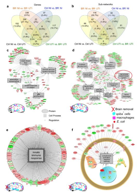Fig. 5: Transcriptional analysis of Control (Ctrl) and Brainless (BRâ) datasets show quantitatively and qualitatively differences for regulated transcripts and cell processes after infection (UTI) or/and not-infection (NI) conditions. a, b) Venn diagram comparing genes (a) and sub-networks (b) differentially regulated for each experimental group-condition. c) Neural-related pathways unique to infection with a brain. d) Neural-related pathways unique to infection without a brain. e) Innate immunity response for brainless animals with infection. This network was significantly upregulated by 11%. f) Complement activation sub-network (classical pathway) exclusively present in infected embryos with absence of brain. Greenâ=âdown gene, Redâ=âup gene. Complete data are presented in Supplementary Data 1. All measured genes found in a pathway are located in Supplementary Data 2. See also Supplementary Figs S4 and S5. |