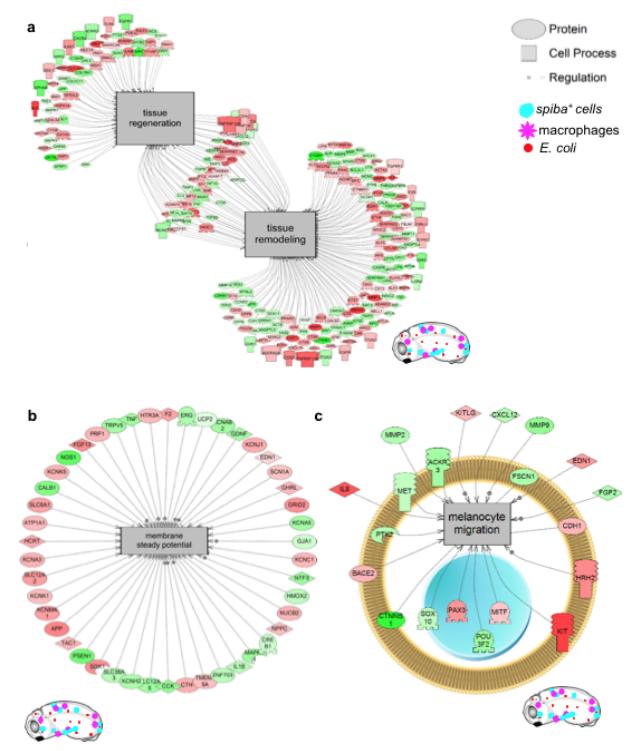 Supplementary Figure S5. Gene networks and cell processes unique to infection in presence of brain. a) Considering the role of the brain on macrophages, which in turn are required for regeneration1, we analyzed transcriptional sub-networks related to regeneration. Gene networks related to tissue regeneration/remodeling were exclusively regulated in intact animals (developing with brain) with presence of bacteria, suggesting a relationship between brain, bacteria, and regeneration. b) Membrane-Potential related genes. Likewise, genes related to membrane potential are exclusively up regulated by 12%, in the presence of brain, confirming our previous results on connection between electrical signaling from the brain and slow electrical flows in the long-distance somatic tissue2,3. c) Melanocyte-migration related genes are suppressed (12%) by infection in presence of a brain. Conversely, in absence of brain, this pathway is not affected. Green = down gene, Red = up gene. Complete data are presented in Supplementary Data 1. All measured genes found in a pathway are located in Supplementary Data 2. |