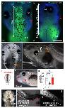 Supplementary Figure S1. Brain Removal, Spinal-Cord resection, Simvastatin-treated and Neural-Crest ablation. a,b) Photomicrographs of Control (Ctrl, a) and Brainless (BRâ, b) stage-48 embryos from the transgenic line PNTub::GFP. To reveal potential differences in proliferative cells at the face region, we performed immunofluorescence on these embryos against the Histone H3 phosphorylated at serine 10 (H3P, red dots pointed by red arrow), a mitosis marker extensively used in Xenopus. Our results in PNTub::GFP brainless embryos show no growth of GFP-labeled tissue at the brain area, indicating absence of brain regeneration after the complete removal (compare white arrows in a indicating the brain and its extension vs. b with no regenerated tissue along the place where the brain should be). These embryos do not display changes in H3P-positive cells at this face area (157±39 for Ctrl and 168±32 for BRâ; unpaired t-test P=0.76), suggesting there is no difference in the proliferative response targeted to regenerate the brain. c, d) Dorsal (c) and lateral (d) views of a late-staged embryo after resection of a constant portion of spinal cord (SC), cervical levels, at stage 25. Orange arrows point the place for surgery removal, showing complete discontinuity between brain and spinal cord. e-g) Neural Crest (NC) ablation assays performed on stage-17 embryos (e, red-dashed square indicates the removed NC domain) and the subsequent aberrant phenotype for the craniofacial elements (f), as defects in branchial arcs (ba) or cement gland (cg). g) Survival rates of Ctrl, BRâ and NCâ infected embryos. Data represent the mean and S.D. of three independent replicates (n=40, N=120). Each replicate is shown by one dot. One-way ANOVA P<0.05. Significant P values after Bonferroni post-hoc test are indicated as *P<0.05, ns P> 0.05. h-j. Dorsal (h) and lateral (i) views of a late-staged embryo after treatment with 0.4 uM Simvastatin for 18 hours, showing severe muscle and tail phenotype (red arrows) but normal brain morphology (white arrow). Photomicrographs after polarized light of the posterior region of the tail in an intact or control (j). a-c, h: rostral is up. d, f, i ,j: rostral is left, dorsal is up. Eyes, gut, and branchial arches (ba) are indicated for reference. |
