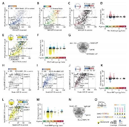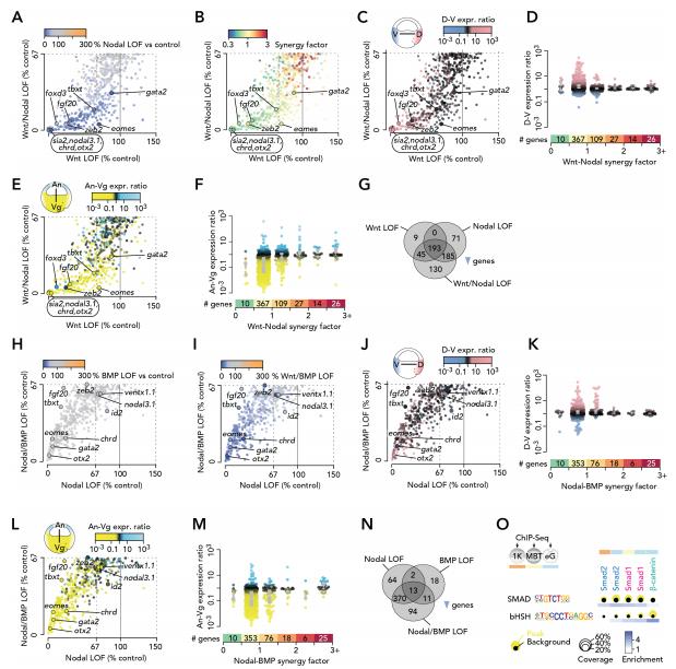 Figure S3. Relationship between Canonical Wnt, Nodal and BMP to Control Regional ZGA, Related to Figure 3. (A-C,E,H-J,L) Scatter plots of relative (% to control) transcript levels between indicated LOFs with each dot (gene) color-coded according to a third attribute: (A,H,I) relative (% to control) transcript levels, (B) synergy factors between single inductive signals, and (C,E,J,L) regional expression ratios between opposite ends of the indicated axis. (G,N) Venn diagram of down-regulated genes by indicated LOFs. (D,F,K,M) Beeswarm boxplots of regional expression (as measured along the indicated axes) depending on increased Wnt-Nodal (D,F) or Nodal-BMP (K,M) synergy. (O) Coverage and enrichment of Smad and β-catenin-associated DNA motifs (SMAD and bHSH motifs) at endogenous binding sites of β-catenin, Smad1, Smad2 (Gentsch et al., 2018b) at indicated developmental stages (color-coded). |