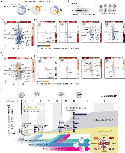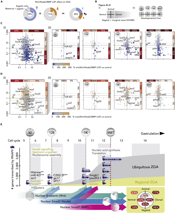 Figure 4. Canonical Wnt, Nodal, and BMP Signals Induce the Majority of Regional ZGA(A) Total percentage of active (zygotic only and maternal-zygotic) genes mis-regulated by Wnt, Nodal, and/or BMP LOF.(B) Graphical explanations of figure panels (C) and (D).(C and D) Summary (i) and temporal resolution (ii) of minimal (C) and maximal (D) transcript levels of active genes (separated by regional expression along the primary body axes) detected among Wnt, Nodal, and/or BMP LOFs. Percentages only refer to the down-regulated (C) or up-regulated (D) genes among all zygotic genes with the same range of expression ratios along the animal-vegetal or dorsoventral axes.(E) Exponential activation of gradually longer genes before the MBT (bulk ZGA) when cell divisions occur at rapid and nearly constant intervals (â¼20 min at 28°C). Sequential induction of the canonical Wnt, Nodal, and BMP pathway is critical to high percentages of regional ZGA (as measured along the two primary body axes within the indicated halves and quadrants of an early gastrula embryo): e.g., â¼89% or â¼98% of gene expression enriched in the dorsal half or vegetal-dorsal quadrant, respectively. |