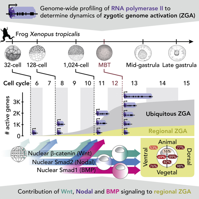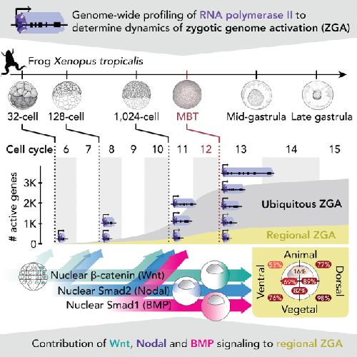 One of the earliest and most significant events in embryonic development is zygotic genome activation (ZGA). In several species, bulk transcription begins at the midblastula transition (MBT) when, after a certain number of cleavages, the embryo attains a particular nuclear-to-cytoplasmic (N/C) ratio, maternal repressors become sufficiently diluted, and the cell cycle slows down. Here we resolve the frog ZGA in time and space by profiling RNA polymerase II (RNAPII) engagement and its transcriptional readout. We detect a gradual increase in both the quantity and the length of RNAPII elongation before the MBT, revealing that >1,000 zygotic genes disregard the N/C timer for their activation and that the sizes of newly transcribed genes are not necessarily constrained by cell cycle duration. We also find that Wnt, Nodal, and BMP signaling together generate most of the spatiotemporal dynamics of regional ZGA, directing the formation of orthogonal body axes and proportionate germ layers.