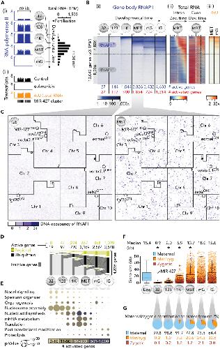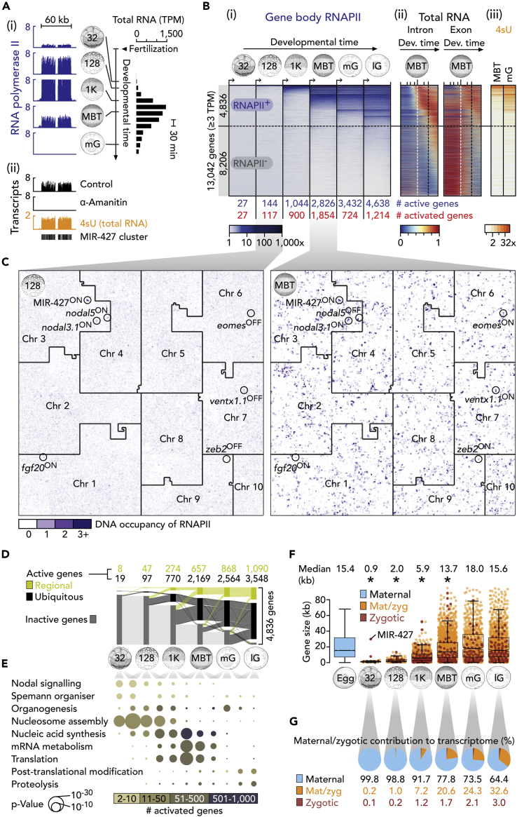 Figure 1. Dynamics and Architecture of ZGA in X. tropicalis(A) (i) Genome-wide profiling of RNAPII and total RNA (Owens et al., 2016) to determine temporal ZGA dynamics. (ii) Complementary approach to detect transcriptionally active genes by α-amanitin-induced loss and 4sU enrichment of nascent (zygotic) transcripts.(B) Progression of ZGA from the 32-cell to the late gastrula stage based on (i) whole gene body (full-length) occupancy of RNAPII (i.e., RNAPII was enriched across entire gene bodies; see Transparent Methods). Co-aligned: (ii) High time-resolution of total RNA, separated by intron- and exon-derived signals, from fertilization to the late gastrula stage, and (iii) enrichments of 4sU-tagged RNA at the MBT and the mid-gastrula stage. Numbers below RNAPII heatmap represent counts of active (blue) and activated (red) genes at the indicated developmental stages. The horizontal dotted line separates RNAPII-engaged (RNAPII+) from non-engaged (RNAPIIâ) genes as detected until the late gastrula stage. The vertical dotted lines in the total RNA plots indicate the developmental time points of the MBT (white) and the late gastrula stage (black), respectively.(C) 2D space-filling (Hilbert) curves showing RNAPII recruitment to chromosomes (Chr) at the 128-cell stage and the MBT. A few zygotic genes are highlighted as being active (ON) or not (OFF) based on their engagement with RNAPII.(D) Alluvial diagram of spatiotemporal ZGA. Tissue specificity inferred from regional transcript enrichments along the animal-vegetal or the dorsoventral axes or both (Blitz et al., 2017).(E) ZGA-associated enrichment of biological processes. The statistical significance of enrichment (hypergeometric p-value) an the number of activated genes associated with each biological process are visualized by bubble size and color, respectively.(F) Beeswarm boxplots of maternal and/or zygotic gene sizes. *, p < 1.9 à 10â7 (Wilcoxon rank-sum test against maternal and post-MBT activated genes); reffect 0.06 (âMBTâ vs âEggâ) - 0.48 (â128â vs âmGâ).(G) Maternal/zygotic contribution to the transcriptome deduced from full-length RNAPII occupancy and maternally inherited RNA.Abbreviations: 32, 32-cell; 128, 128-cell; 1K, 1,024-cell; MBT, midblastula transition; mG, mid-gastrula; lG, late gastrula; 4sU, 4-thiouridine; Mdn, median; TPM, transcripts per million. See also Figure S1 and Tables S1 and S2. |