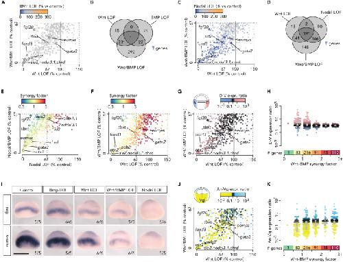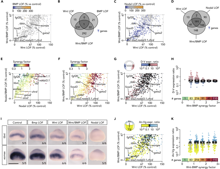 Figure 3. Uniform Gene Expression across Dorsoventral Axis Achieved by Wnt/BMP Synergy(A, C, E, F, G, and J) Scatterplots of relative (% to control) transcript levels between indicated LOFs with each dot (gene) color-coded according to a third attribute: (A and B) relative (% to control) transcript levels, (E and F) synergy factors between single inductive signals, and (G and J) regional expression ratios between opposite ends of the indicated axis.(B and D) Venn diagram of down-regulated genes by indicated LOFs.(H and K) Beeswarm boxplots of regional expression (as measured along the indicated axes) depending on increased Wnt-BMP synergy.(I) Whole-mount in situ hybridization (WMISH) of tbxt and eomes transcripts under various LOFs. Control and Nodal LOF pictures are from Gentsch et al. (2018b).See also Figure S3 and Table S3. |